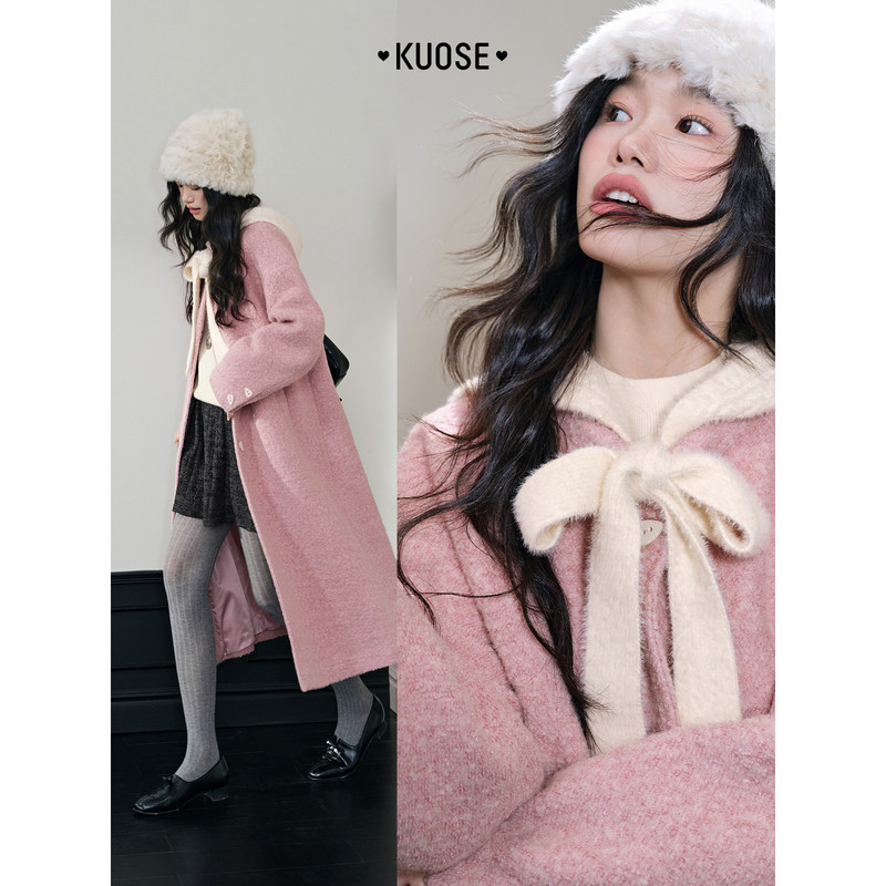 阔色粉色可拆卸连帽毛呢外套长款女2025冬季新款穿搭羊毛呢子大衣