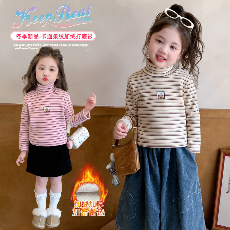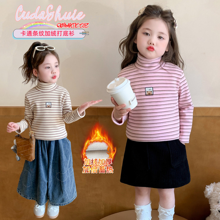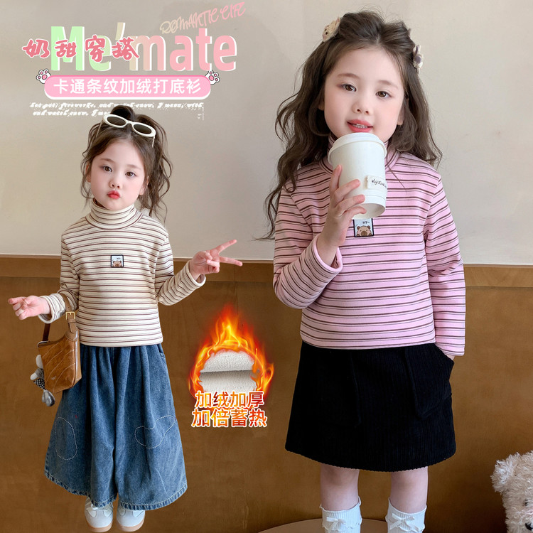 新款女童可爱加绒加厚保暖打底衫一体宝宝绒儿童条纹高领冬季内搭