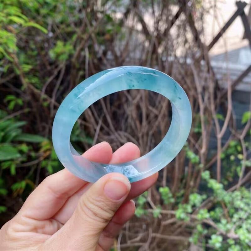冰种翡翠手镯飘蓝花正圈女款缅甸老坑冰透玉石镯子阳绿玉镯处理
