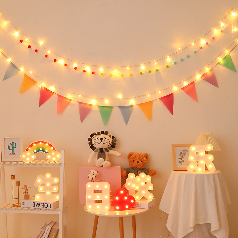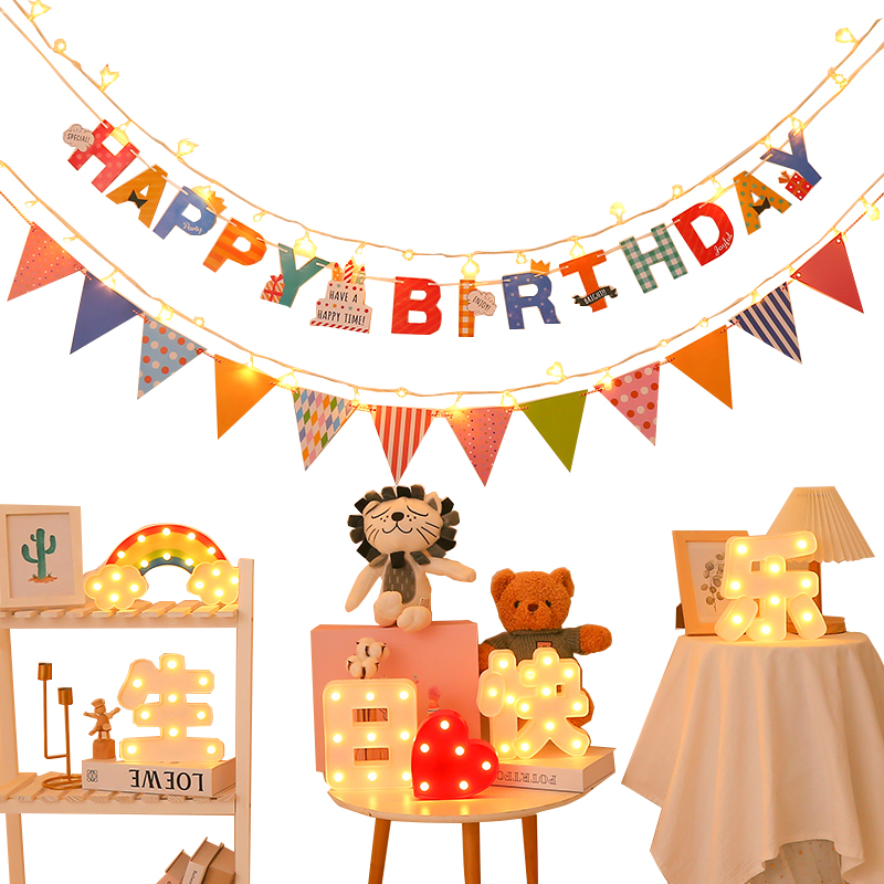 生日快乐发光字牌装饰led小彩灯闪灯串灯吊旗烫金字母拉花三角旗