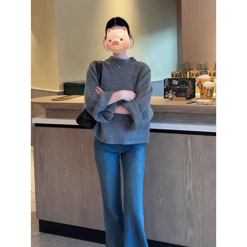巨好看的灰色圆领套头毛衣女秋冬加厚宽松慵懒风独特漂亮早秋上衣