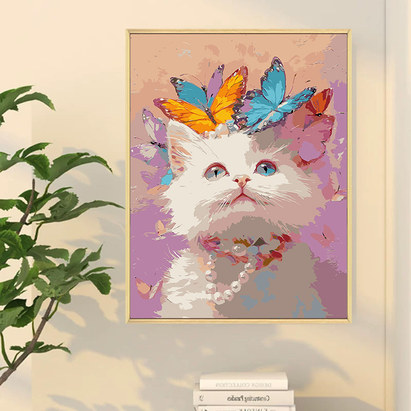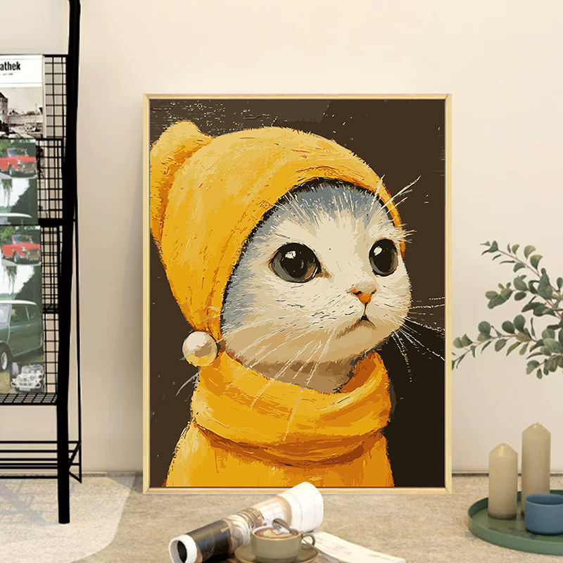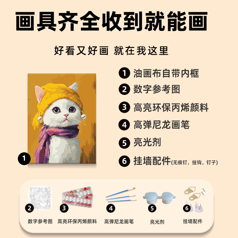戴珍珠耳环的猫咪数字油画diy填充填色手工绘丙烯油彩画装饰挂画