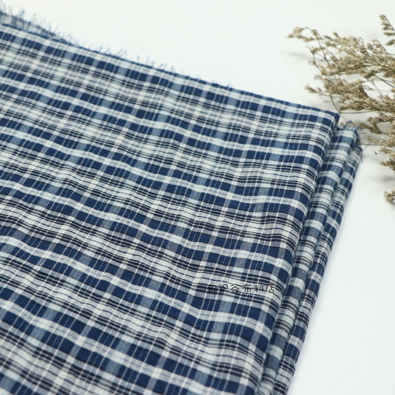 日单文艺灰蓝色织格子涤棉麻布料简约衬衣连衣裙旗袍服装手工面料