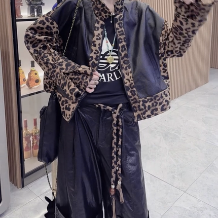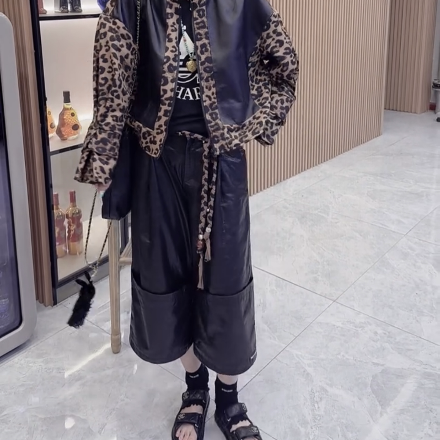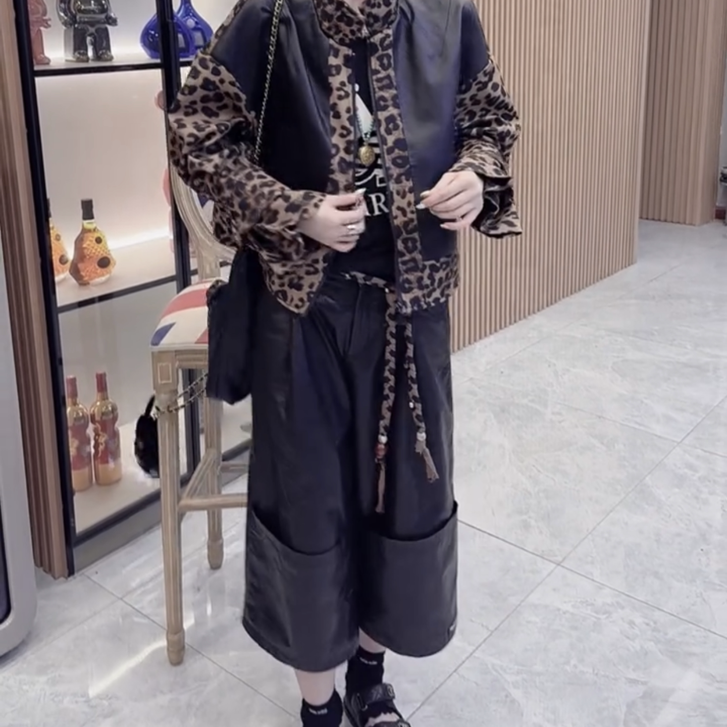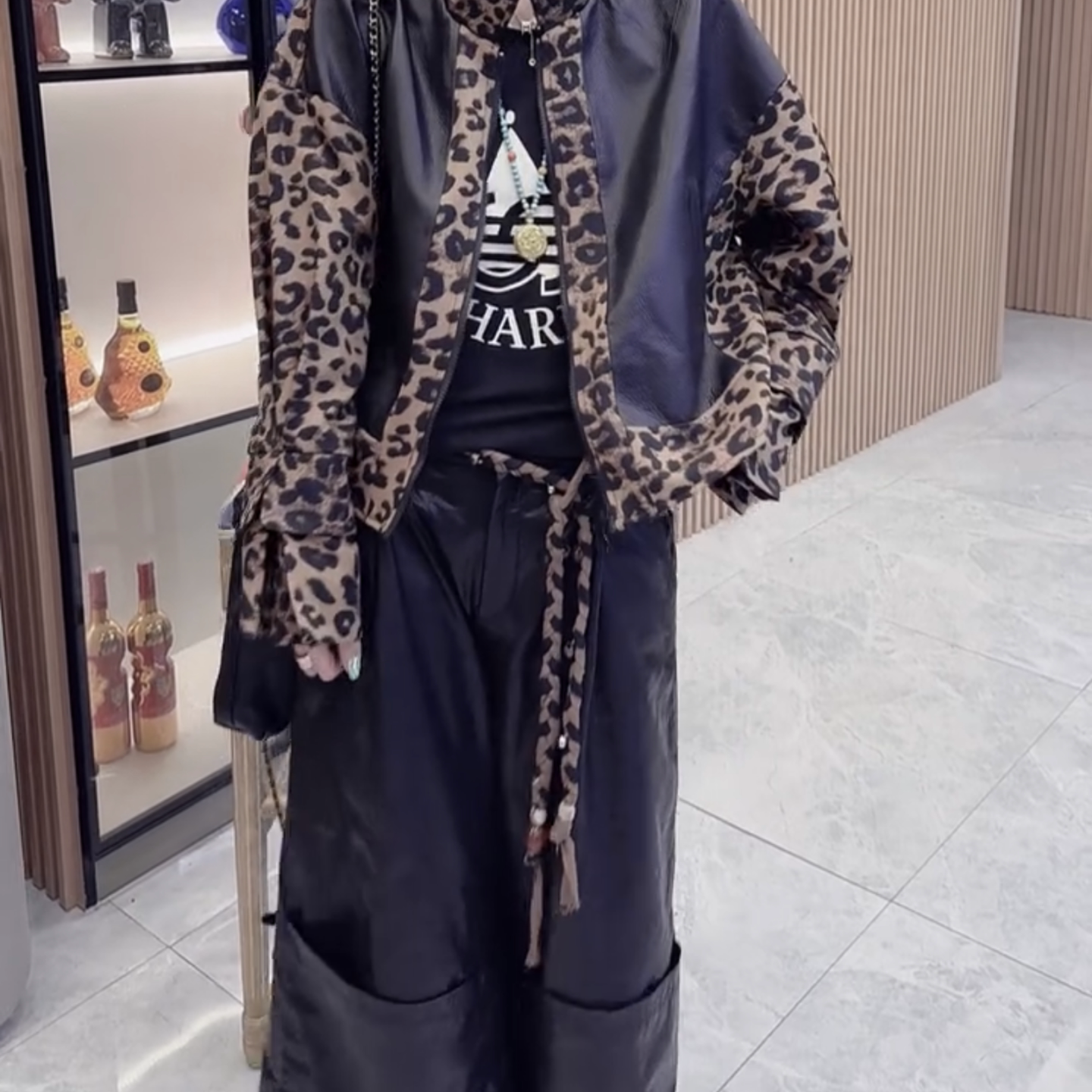 欧货秋季新款真皮皮衣女短款立领绵羊皮拼豹纹布料夹克外套宽松潮