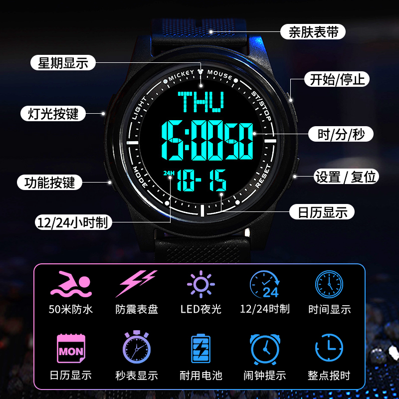 迪士尼电子手表男款学生初中高中生儿童男生青少年男孩防水电子表