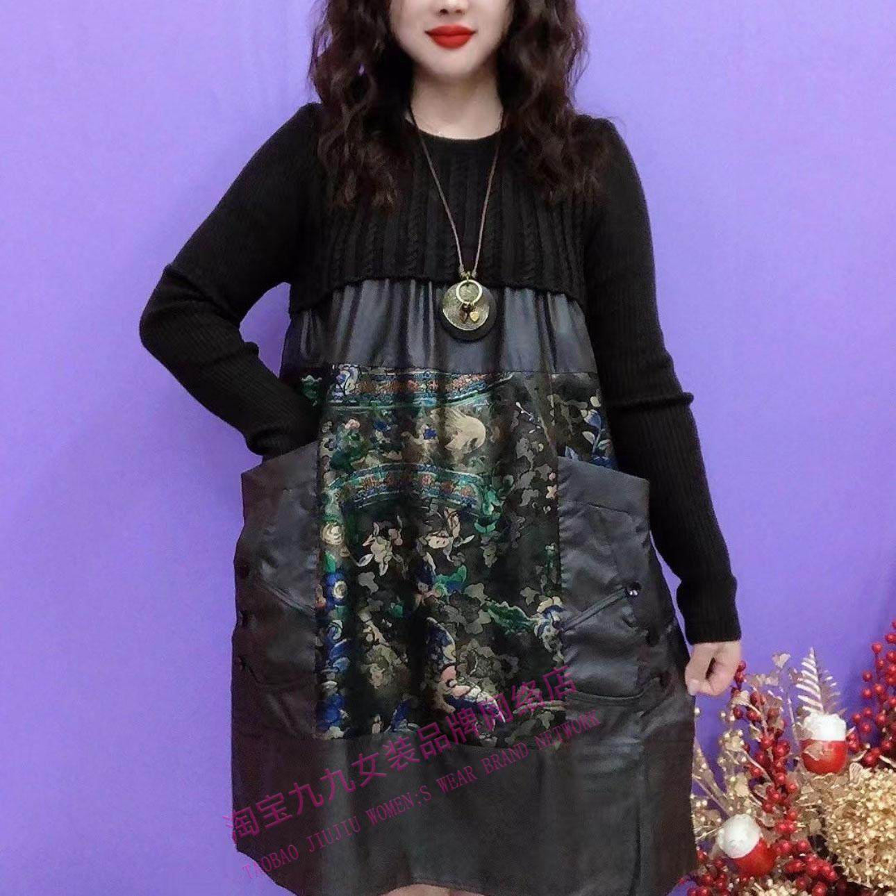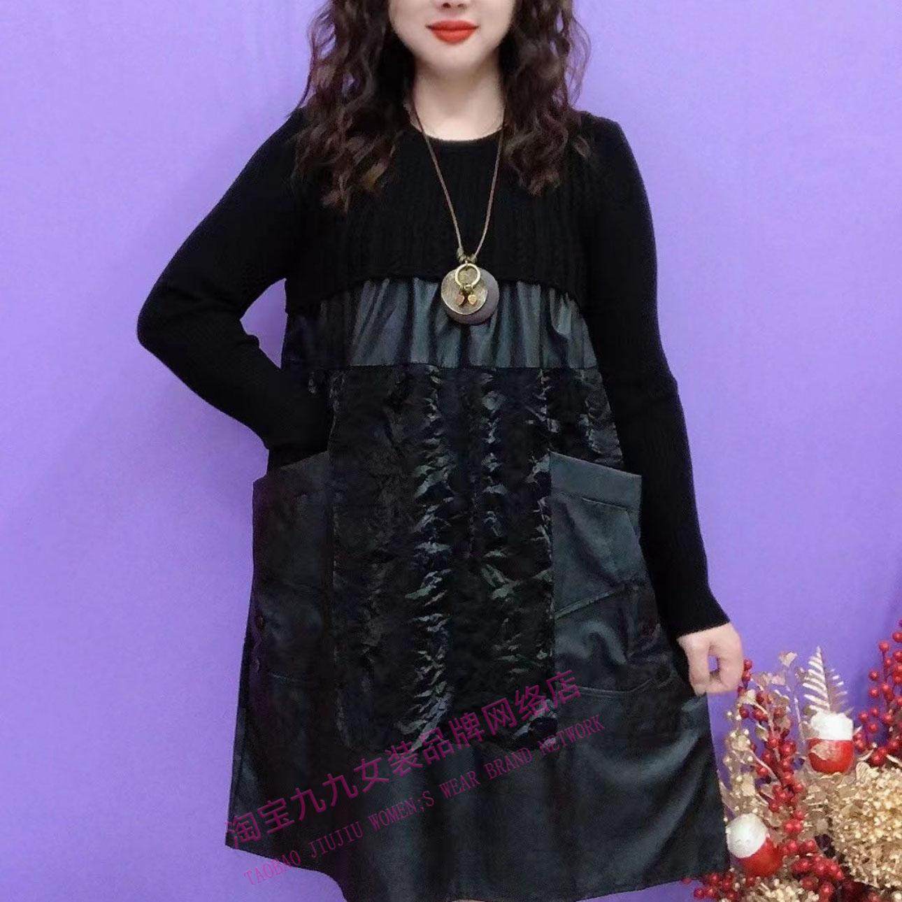 针织拼接水洗皮连衣裙女士秋冬时尚遮屁股显瘦气质款配大衣打底裙