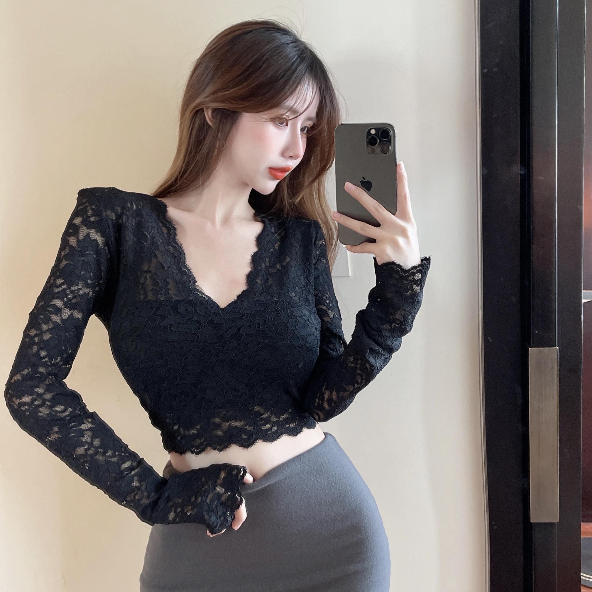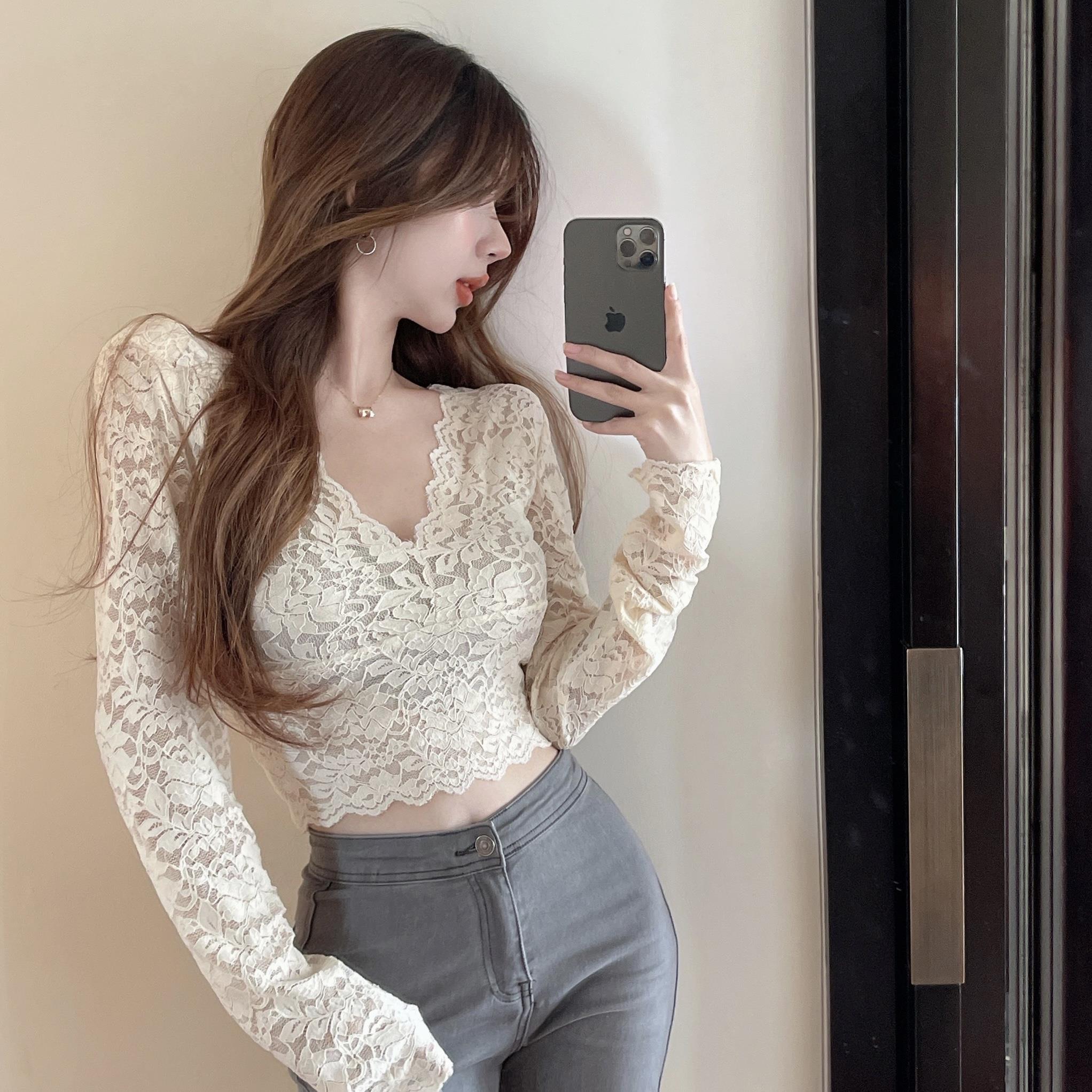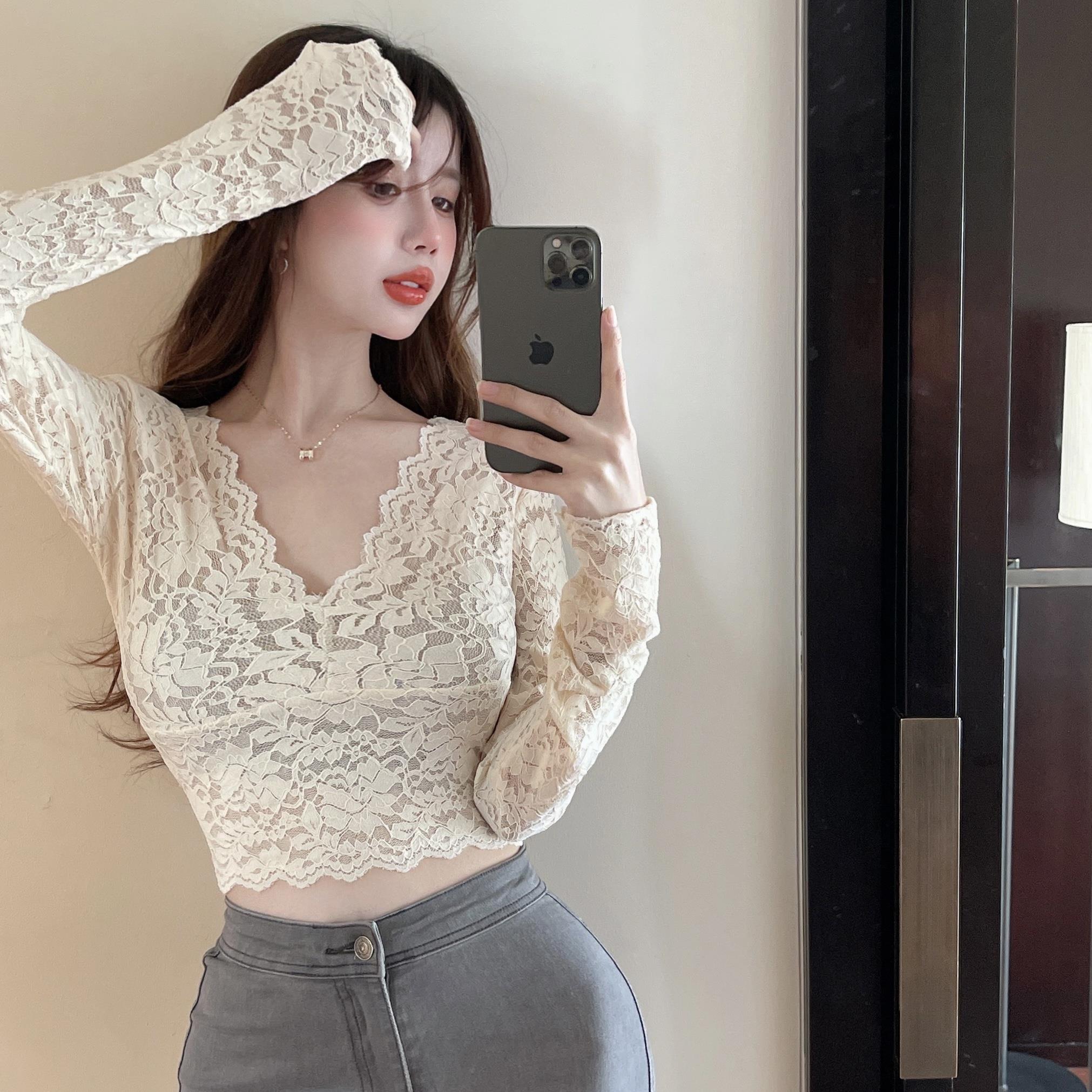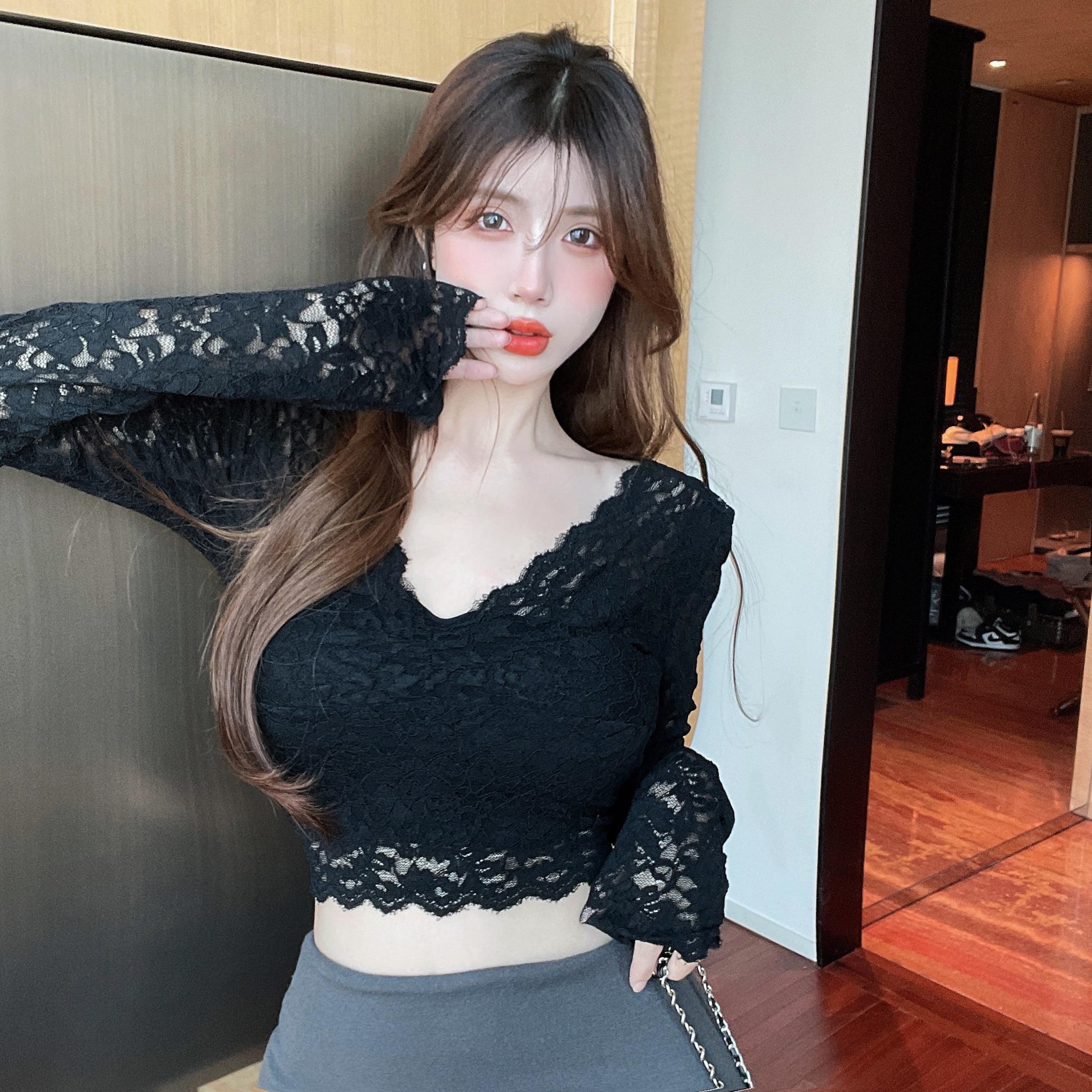 纯欲辣妹V领蕾丝打底衫女内搭设计感露脐短款别致长袖独特上衣秋