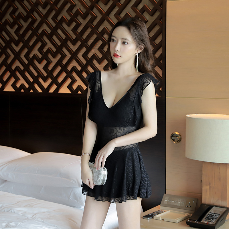 新款显瘦高腰连衣裙短裙 性感v领连体泡温泉女士A字连衣裙蕾丝