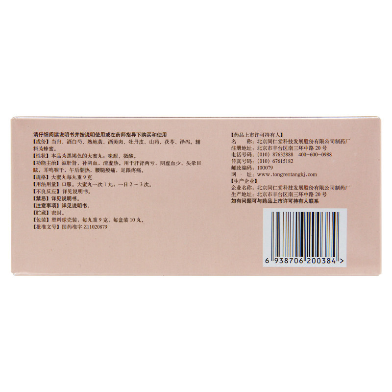 同仁堂归芍地黄丸9g*10丸/盒肝肾两亏阴虚血少腰腿痠痛足跟疼痛