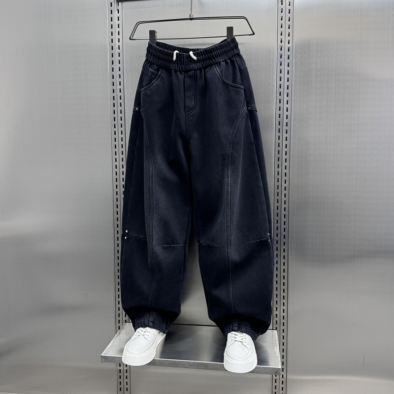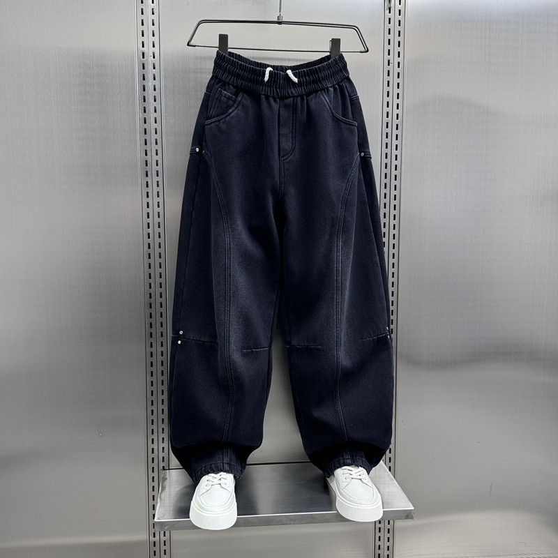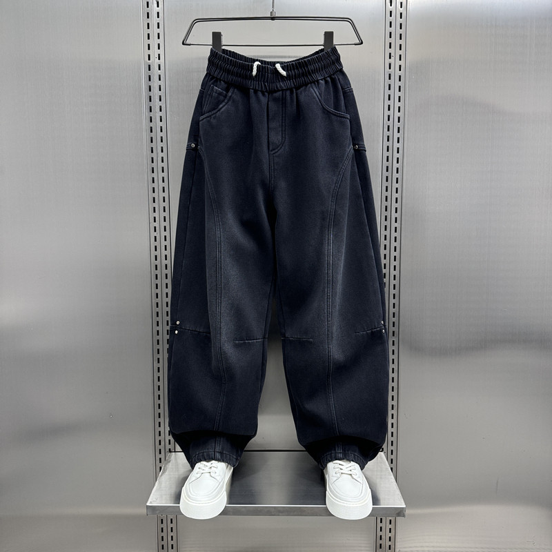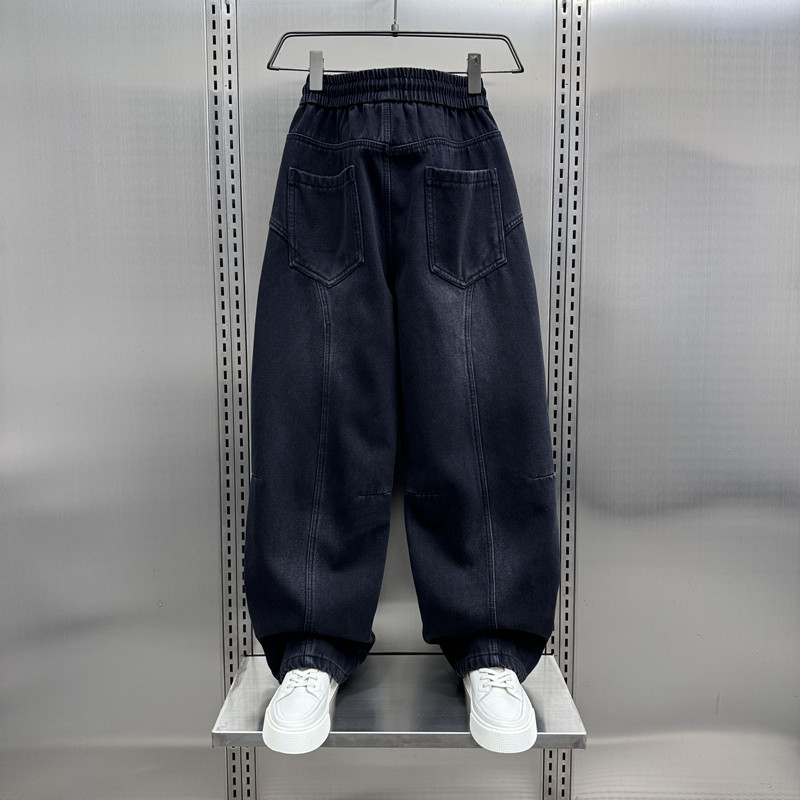 秋冬新款痞帅水洗拼接加绒牛仔裤男士2024新款宽松直筒阔腿哈伦裤