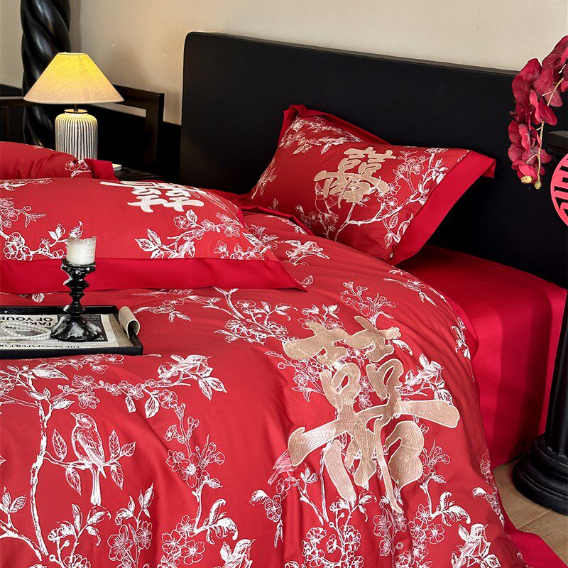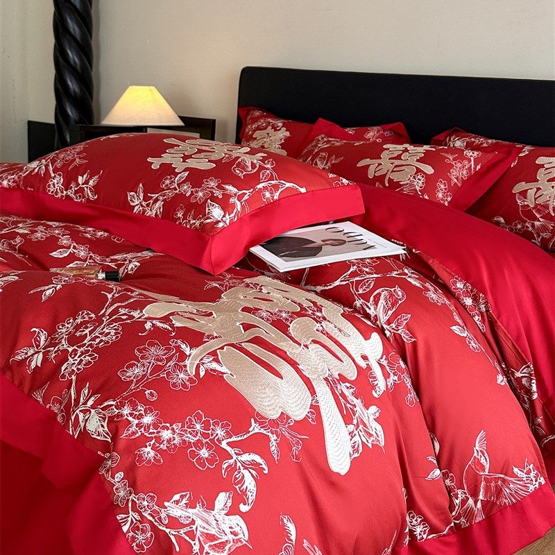 浪漫婚庆100支床单四件套x红色被套新婚喜被结婚床上用品4