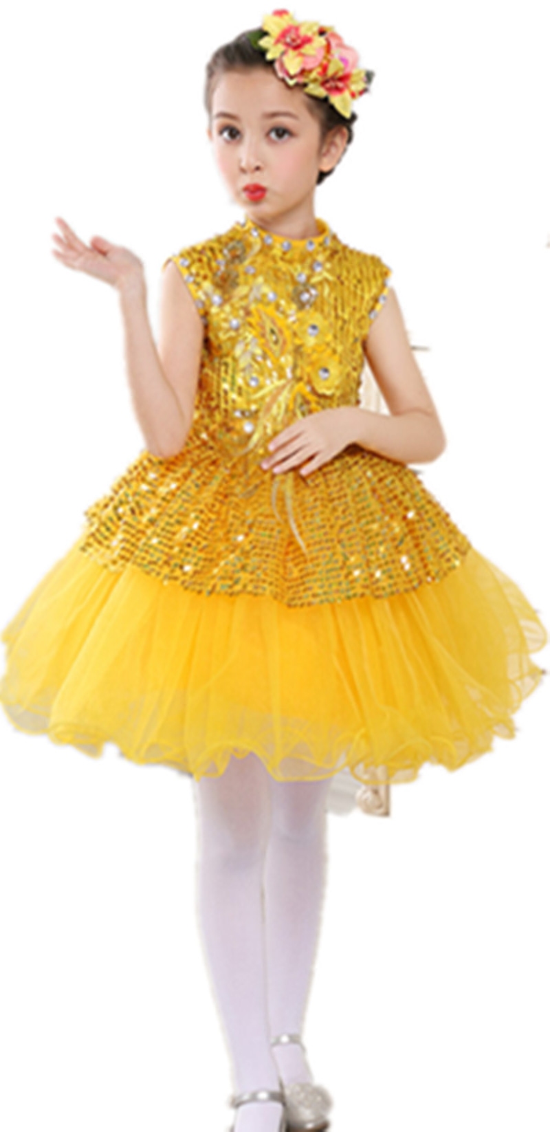 六一新公主连衣裙亮片蓬蓬纱裙学生合唱服装儿童演出服校服黄色女