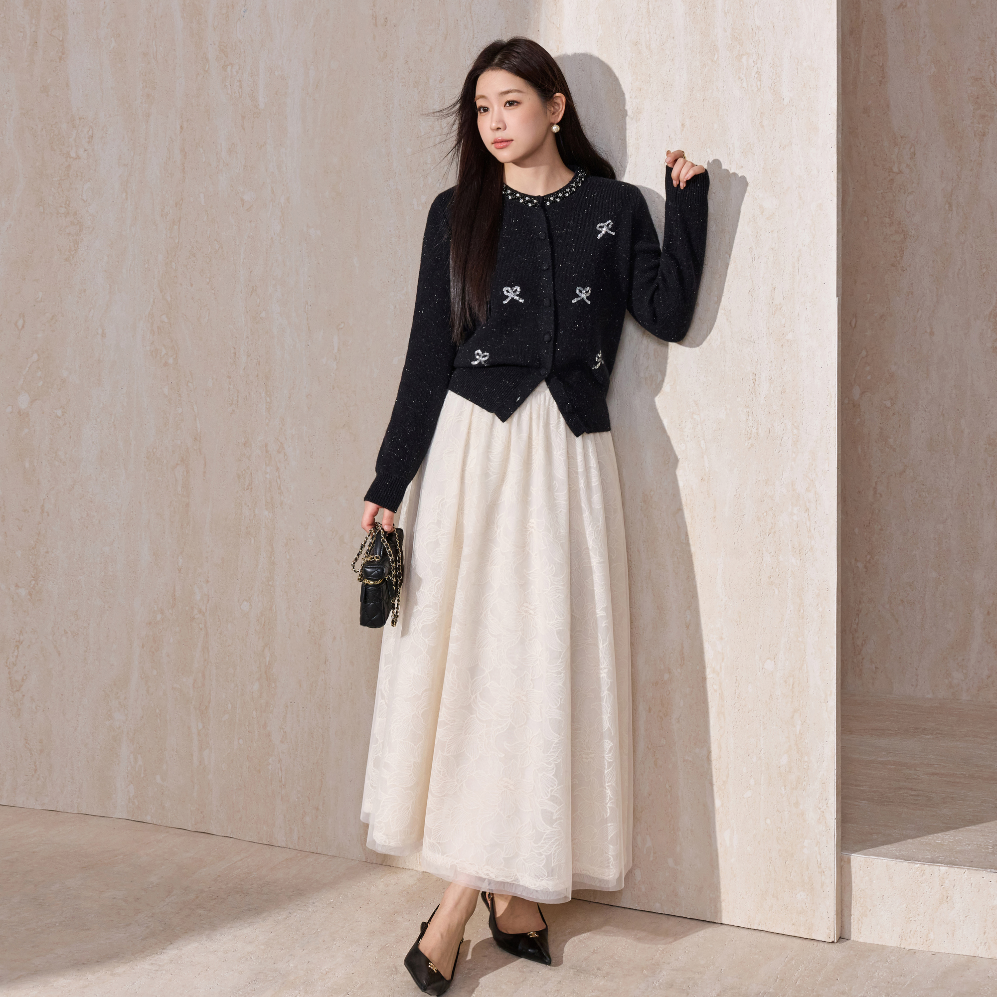 蓝语大码女装洋气蝴蝶结圆领针织毛衣蕾丝网纱半身裙套装2025秋