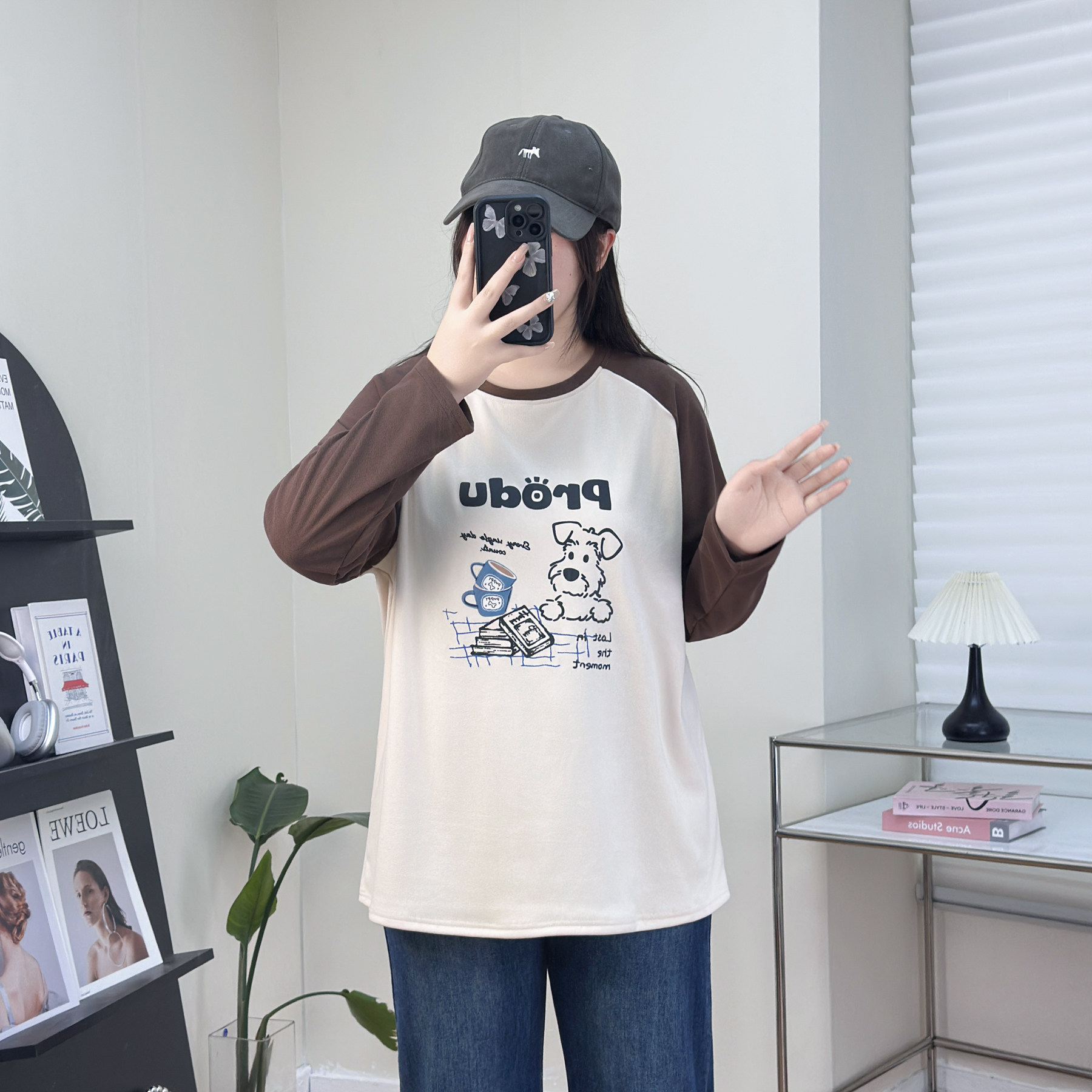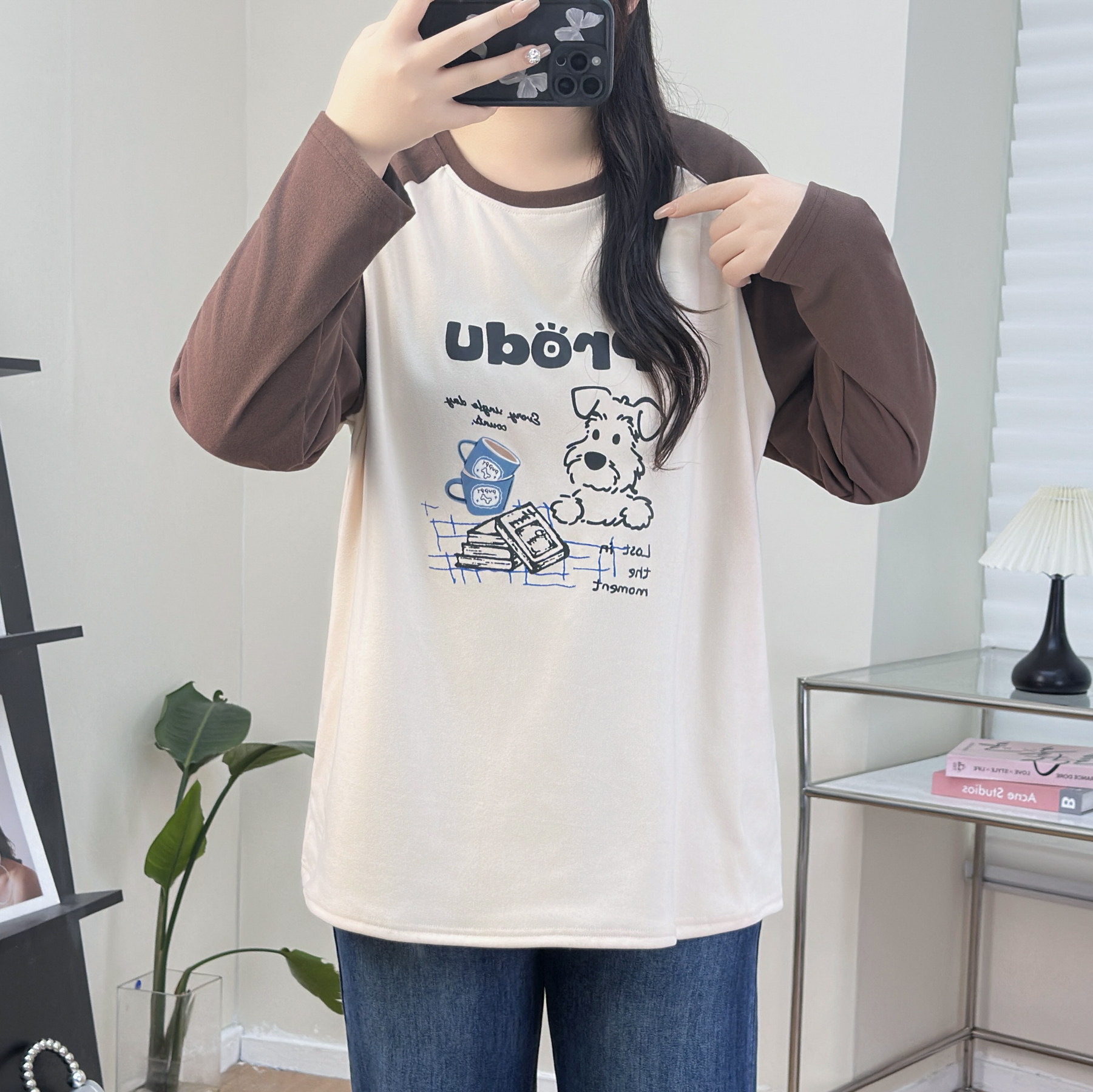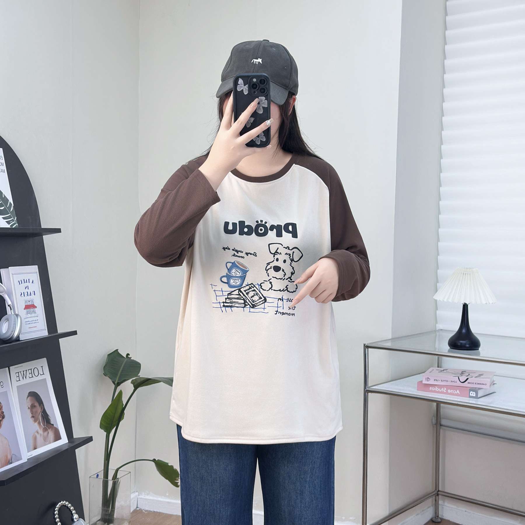200斤大码女装秋冬新款卡通印花拼色袖胖妹妹打底衫遮肚子显瘦