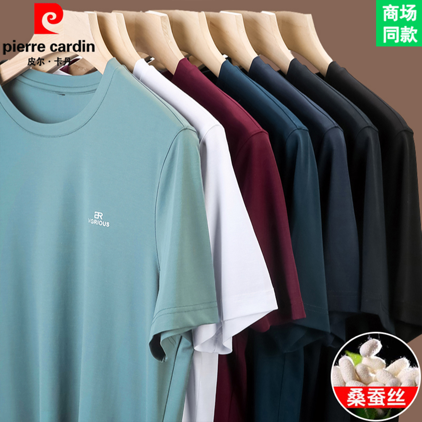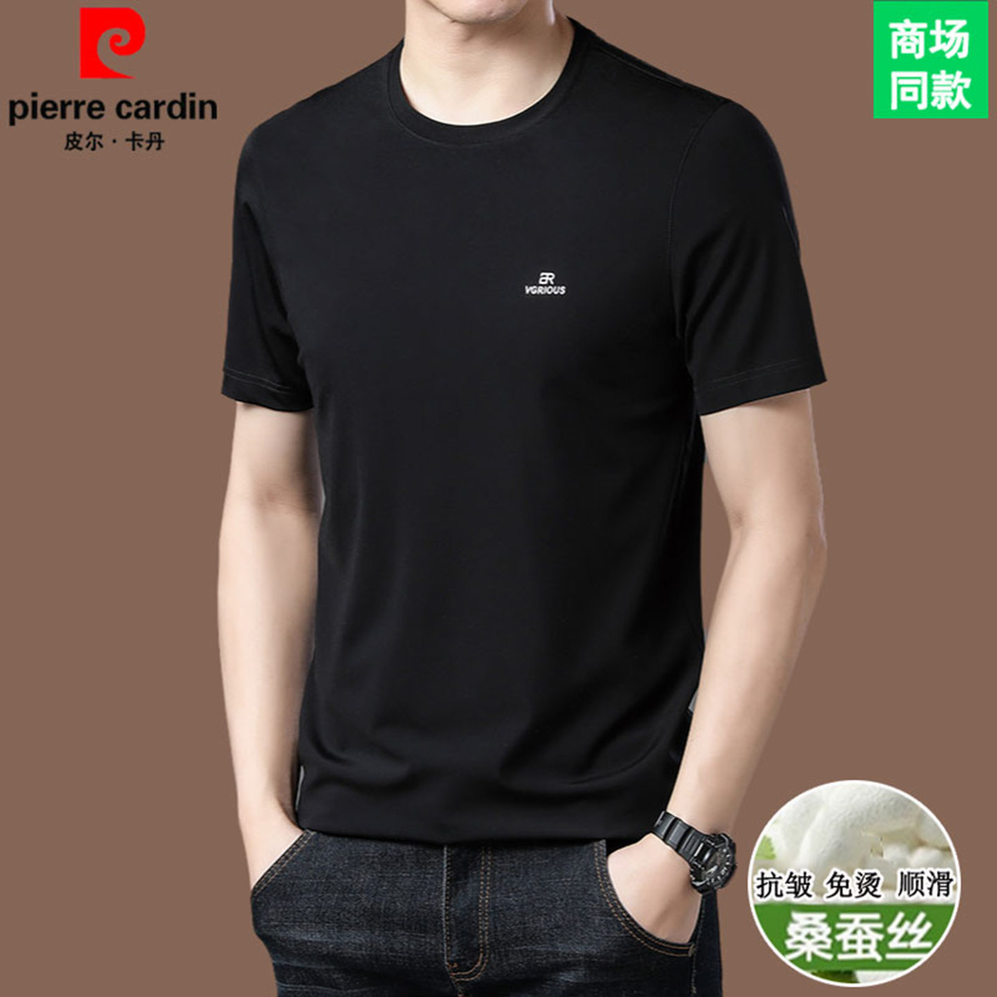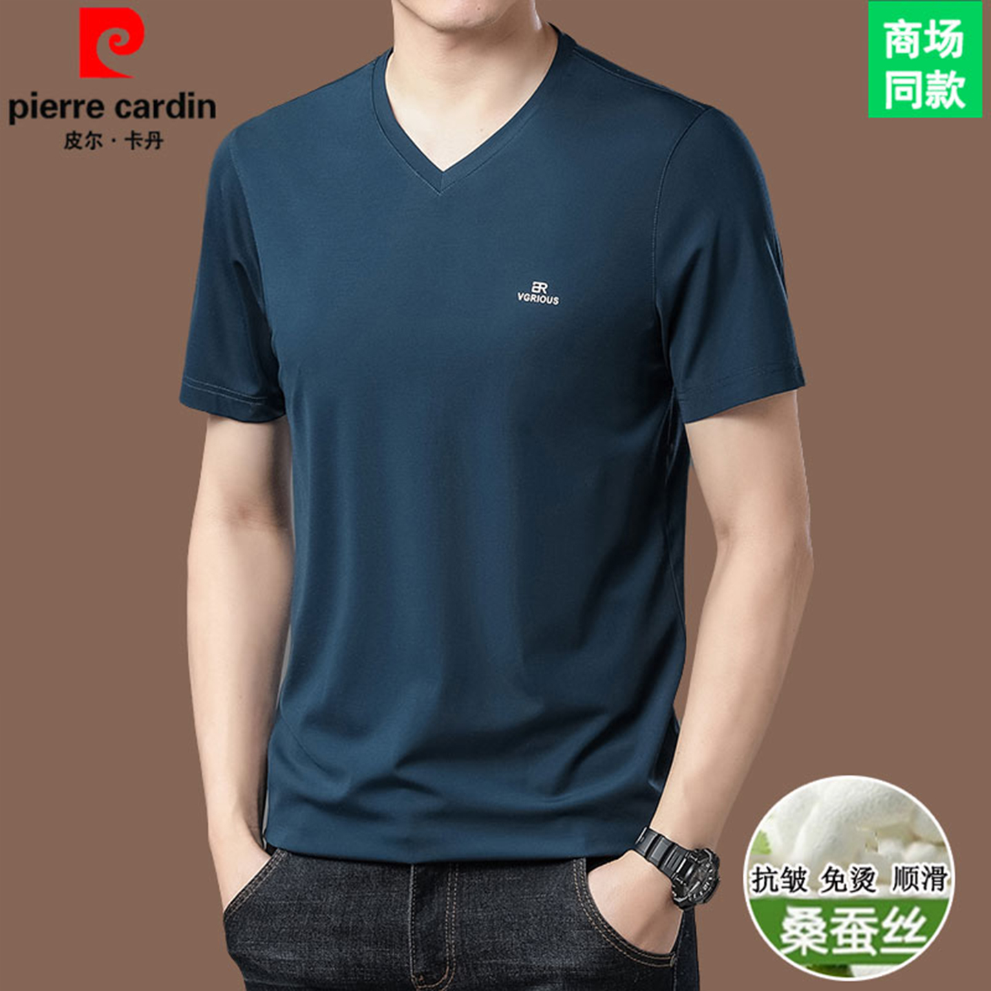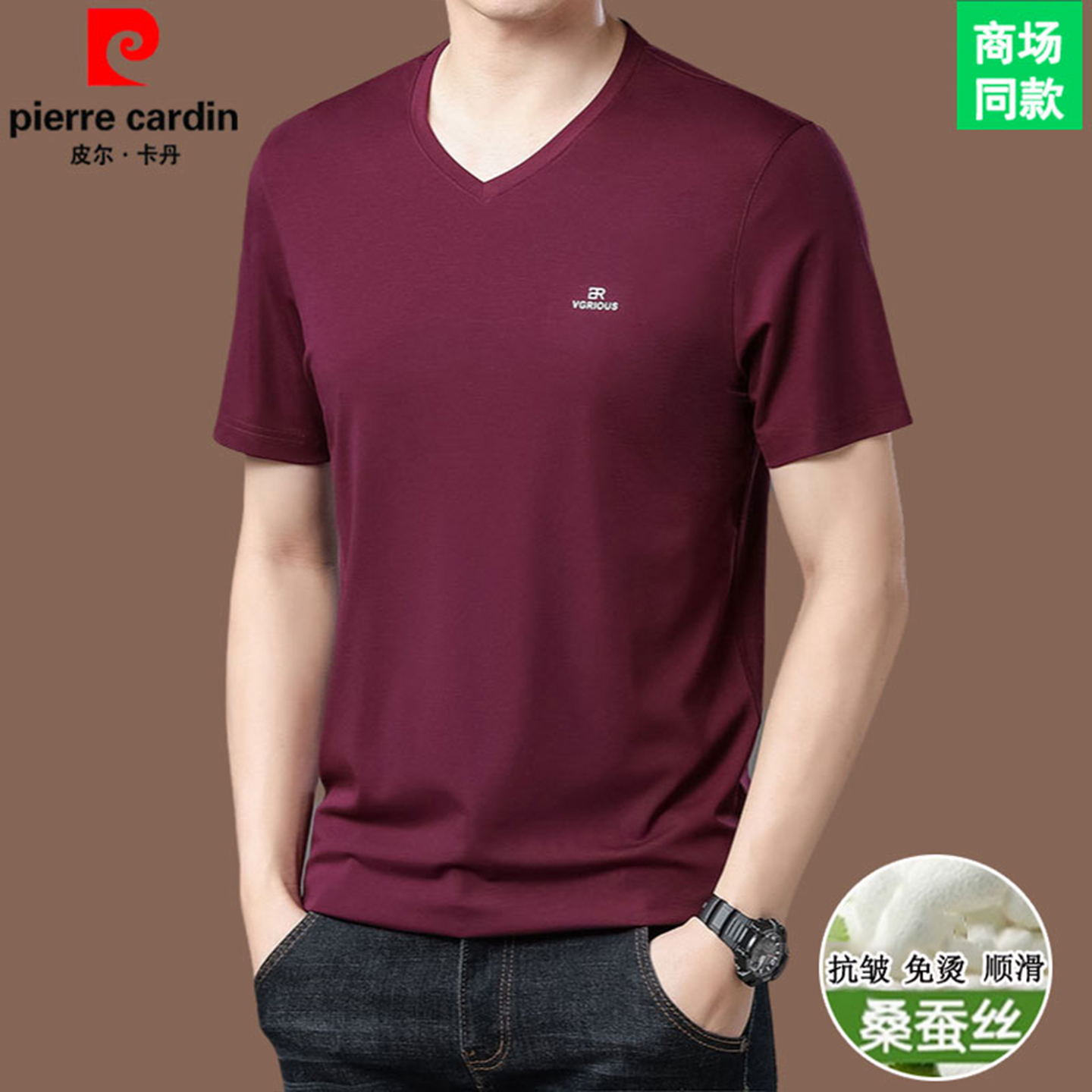 皮尔卡丹高端桑蚕丝短袖t恤男士无痕V领时尚半袖高级感真丝打底衫