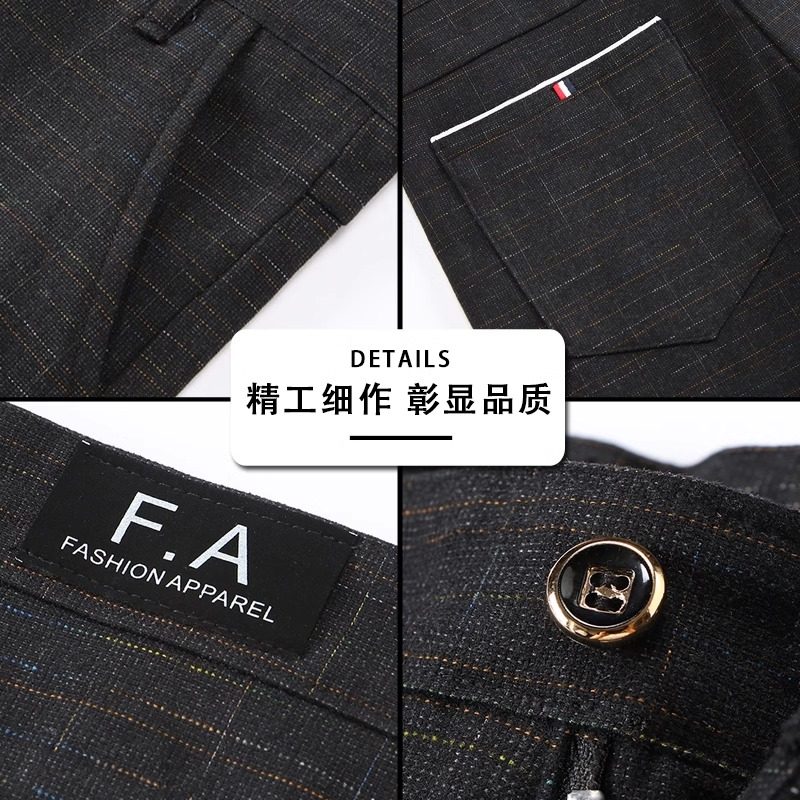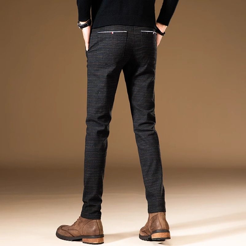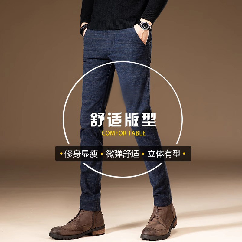花花公子秋冬加绒休闲裤男修身直筒韩版潮流棉麻格纹小脚长裤子男