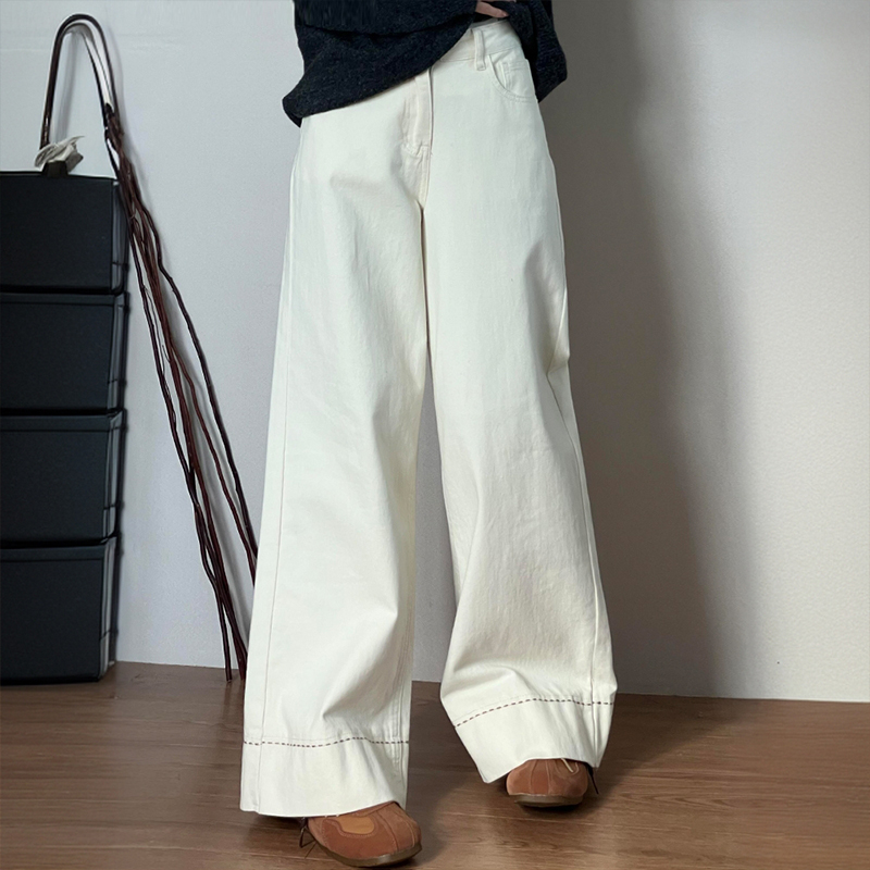 大码女装胖mm美式高街牛仔裤女春秋新款米白色裤子高腰显瘦阔腿裤
