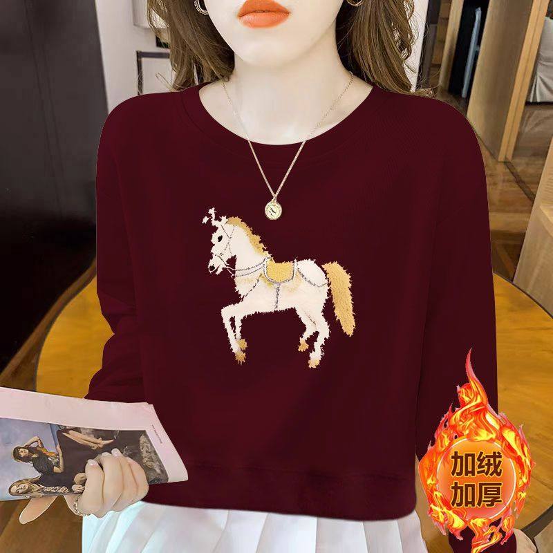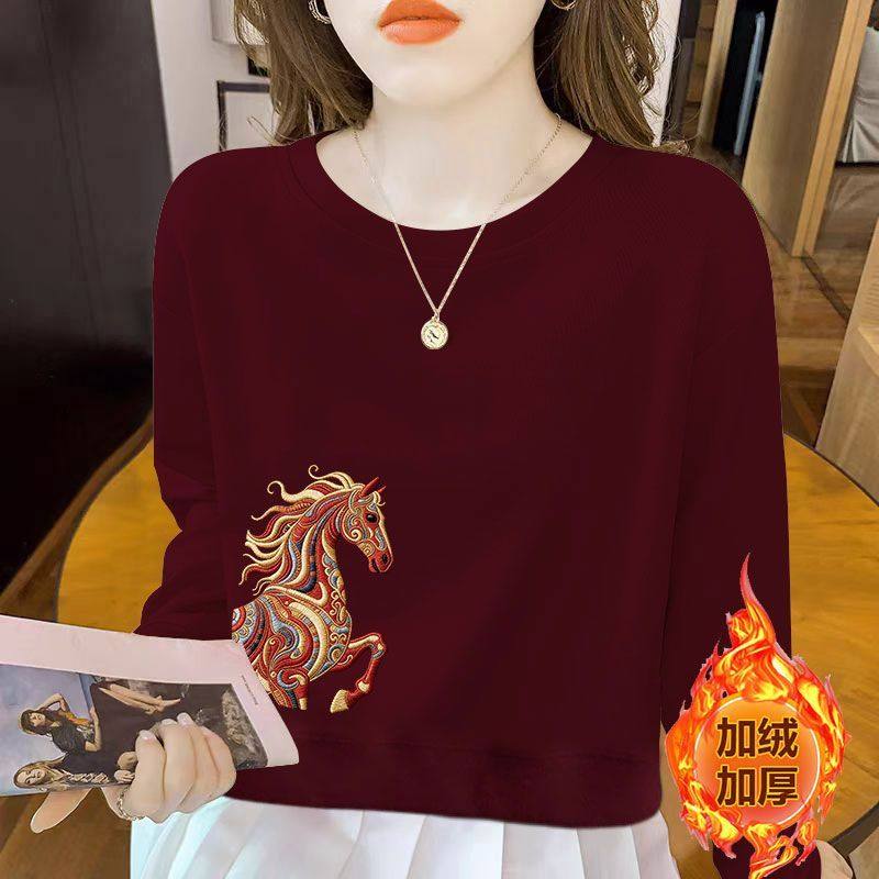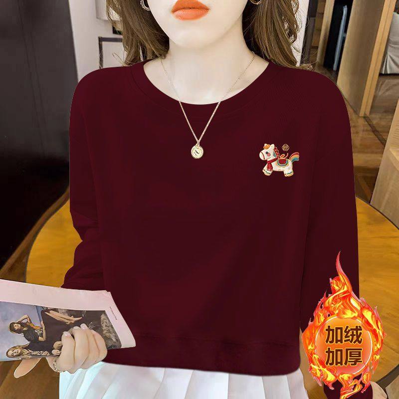 新年加绒加厚圆领卫衣女秋冬新款休闲潮流设计感遮肉上衣女ins