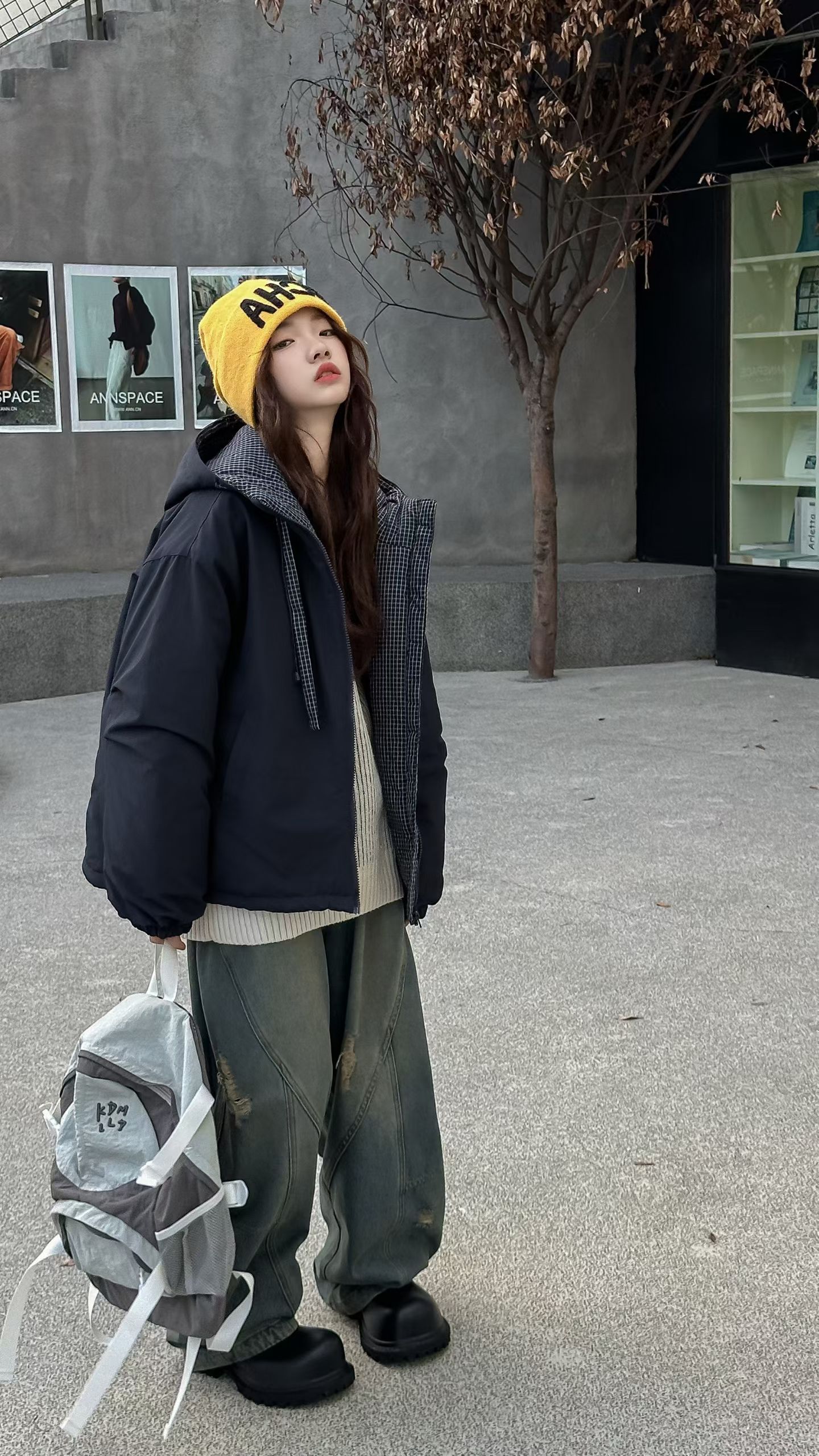 女大童连帽冲锋衣棉衣2025秋装新款青少年格纹拼韩版拉链夹克外套