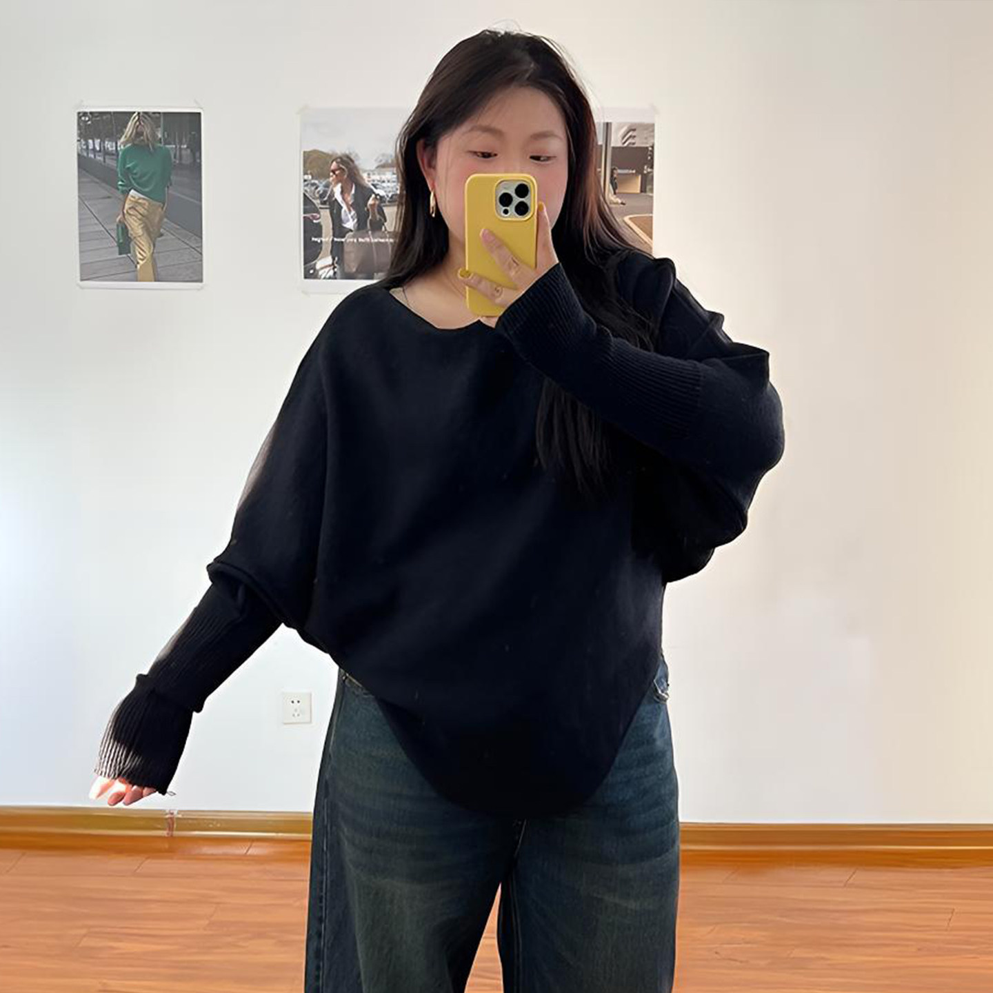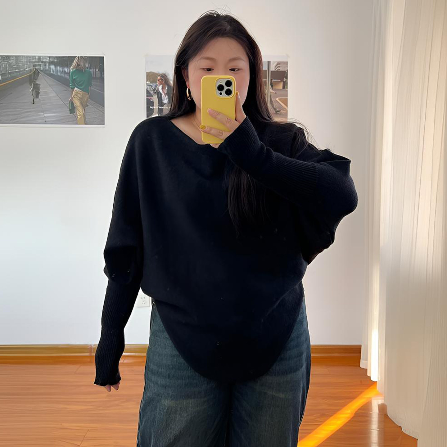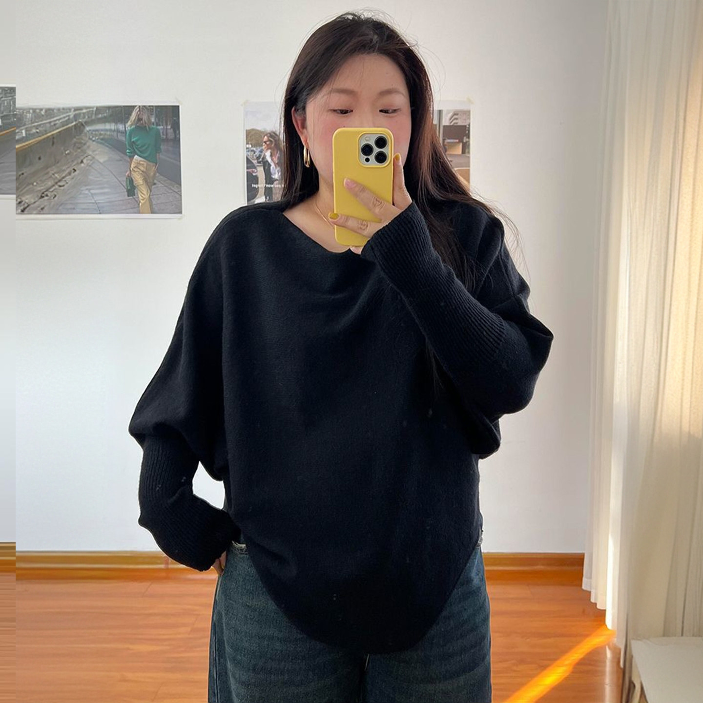 300斤大码女装黑色宽松显瘦斜肩上衣女胖mm简约百搭蝙蝠袖针织衫