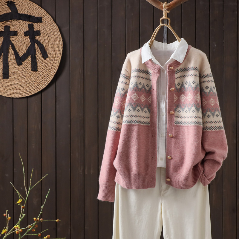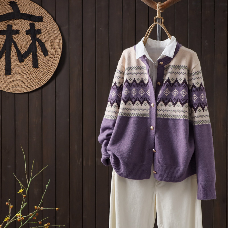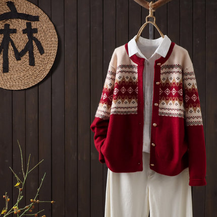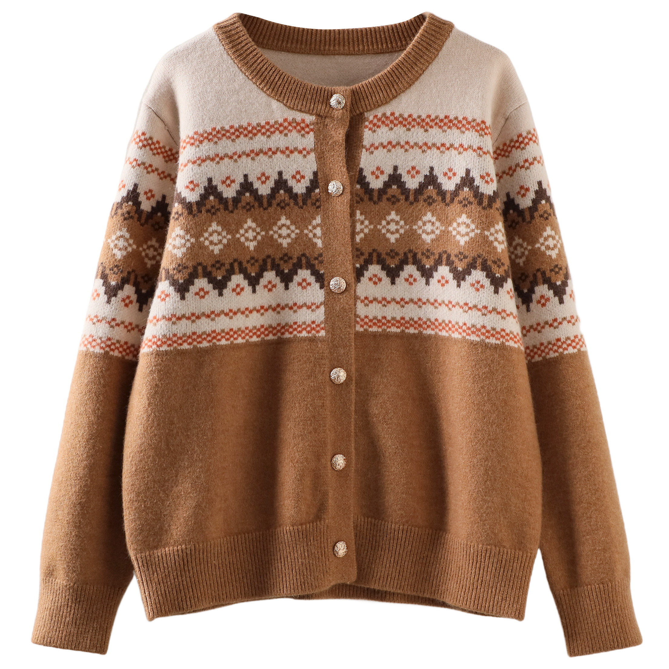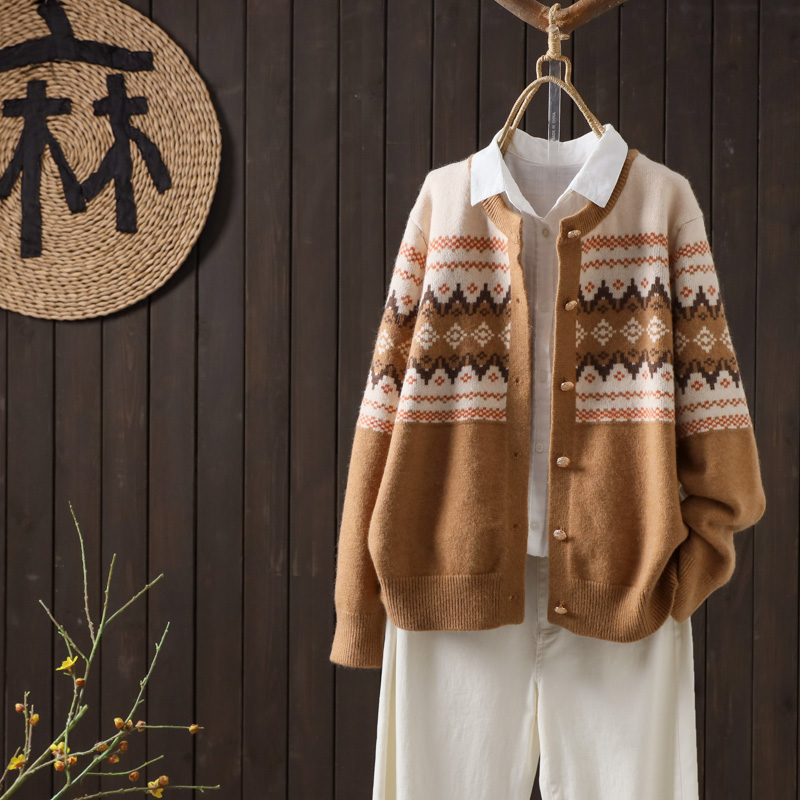 民族风复古文艺范针织开衫女装秋冬新品圆领提花宽松百搭毛衣外套