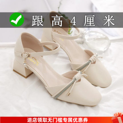 品牌特价蝴蝶结包头凉鞋女夏季新款百搭浅口方头粗跟扣带中跟单鞋