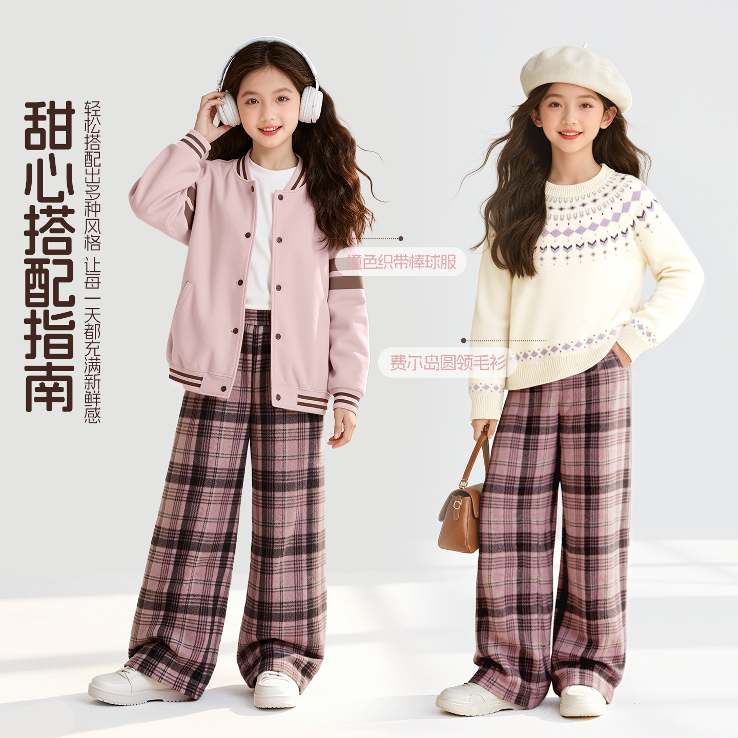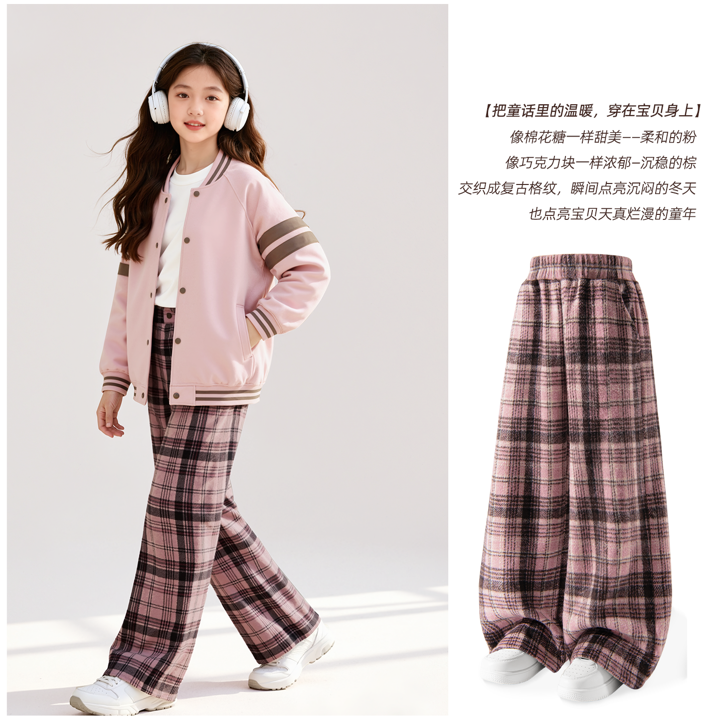 真维斯club儿童裤子女孩加绒阔腿裤2025新款女童秋冬时髦格子长裤