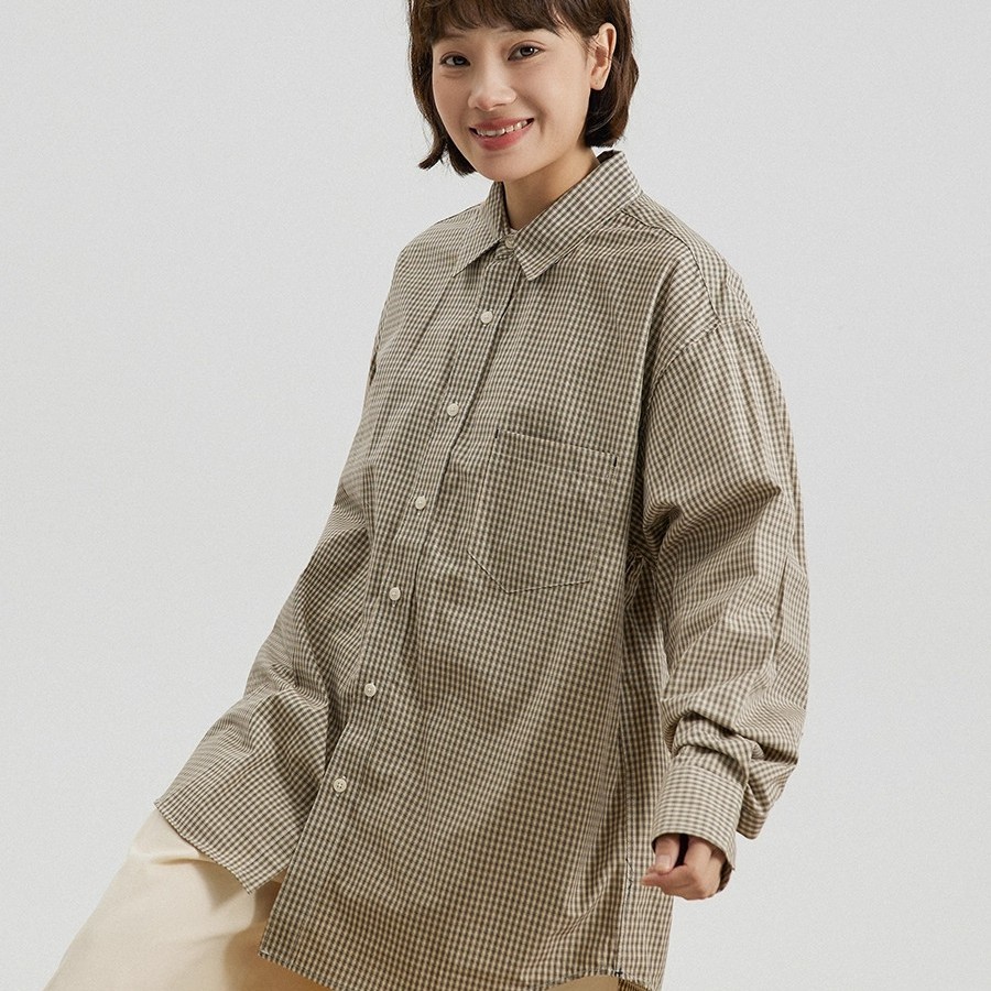 GoodNorth设计感复古卡其格子衬衫男女同款长袖上衣宽松翻领衬衣