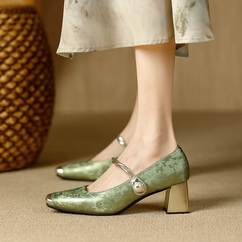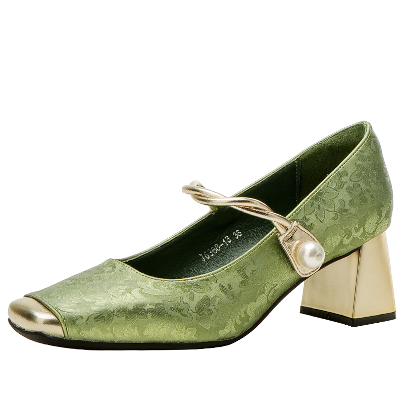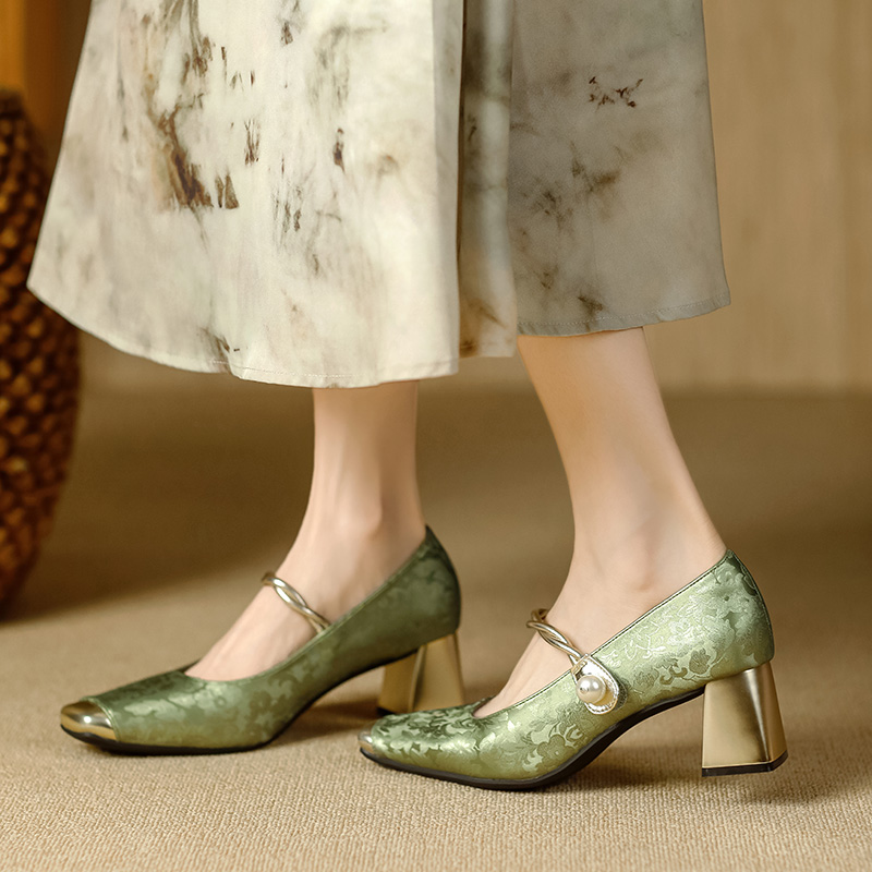 绿色新中式粗跟方头配旗袍高跟鞋
