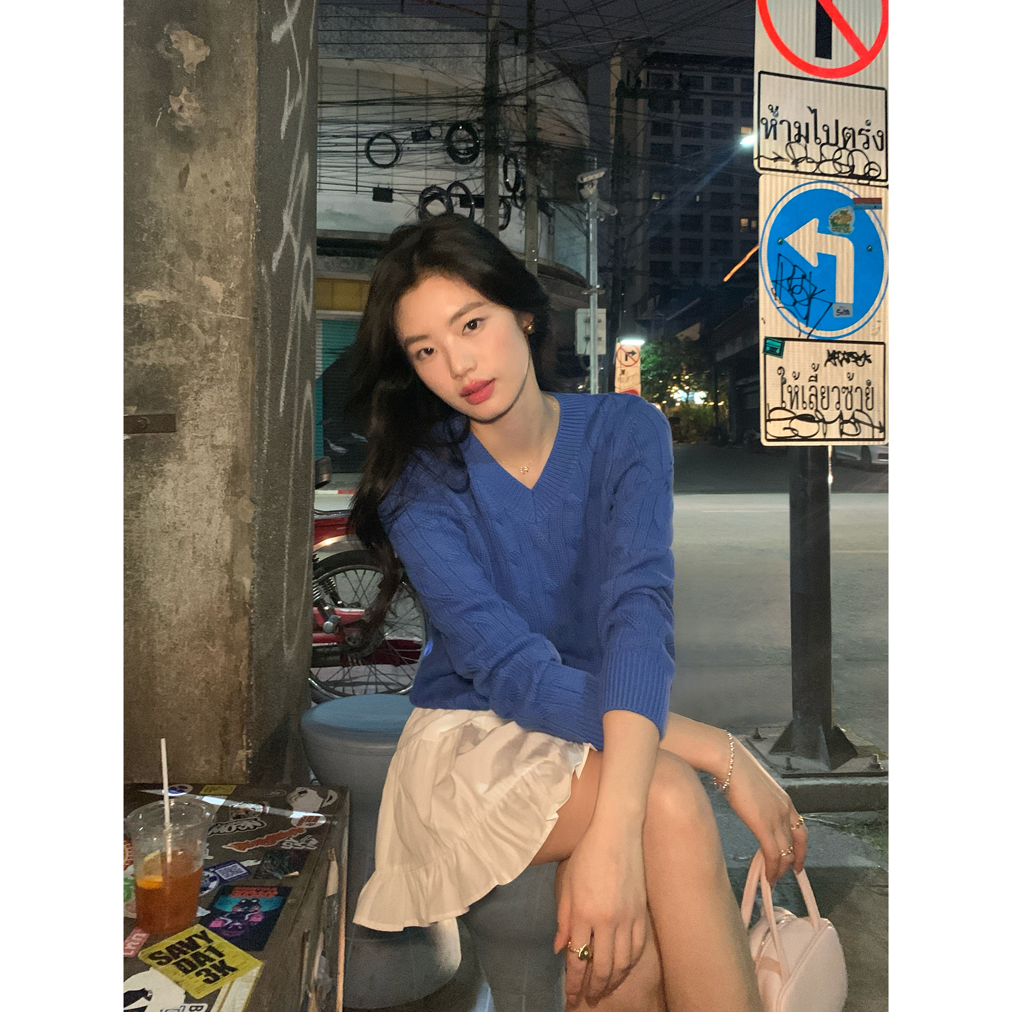 pusumede 米黄色v领麻花长袖针织衫女设计感套头毛衣宽松气质上衣