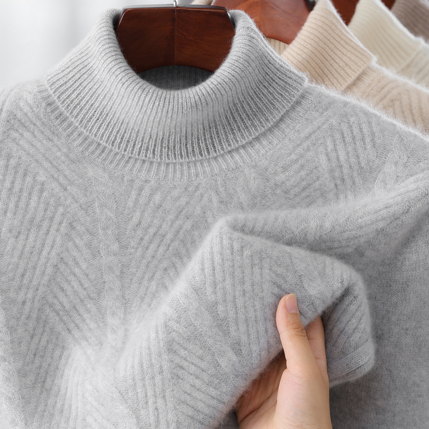 秋冬新款纯羊毛衫男士高领加厚人字纹保暖针织毛衣打底羊毛衫上衣