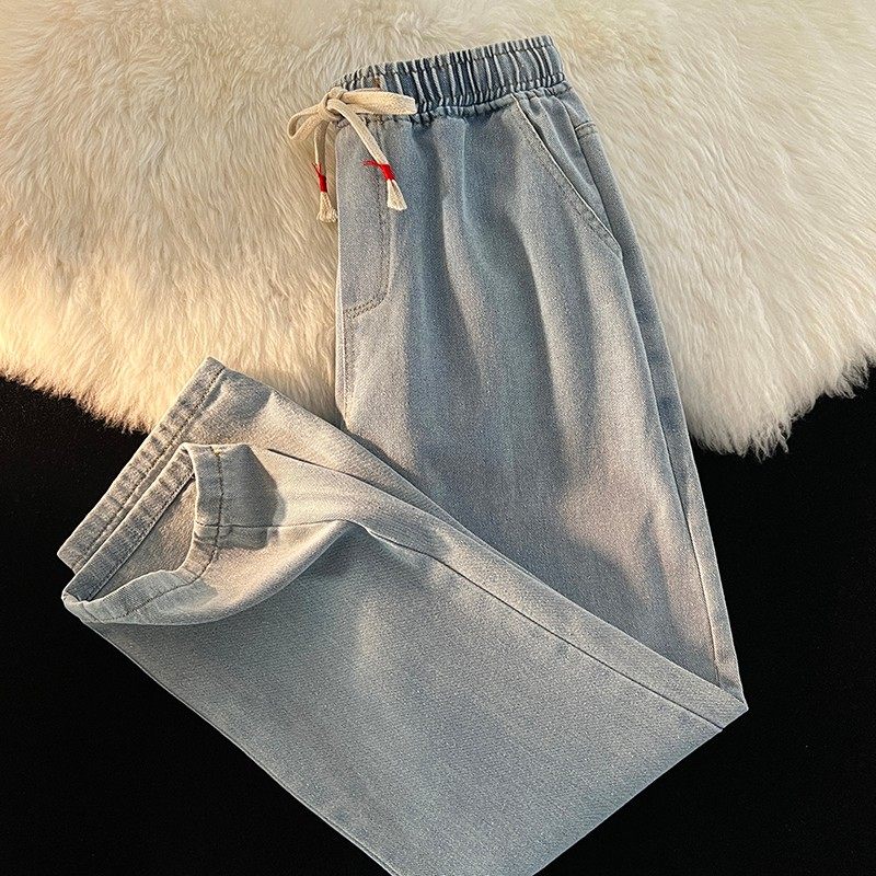夏季薄款系绳直筒水洗牛仔裤男士复古宽松休闲修身青少年阔腿长裤