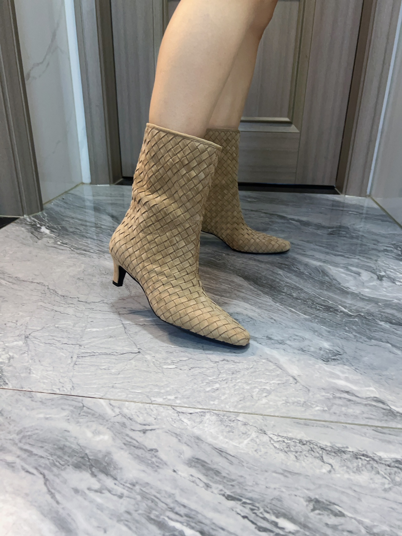 巴黎台版潮流纯手工编织牛磨砂皮羊皮内粗跟中筒靴女靴子