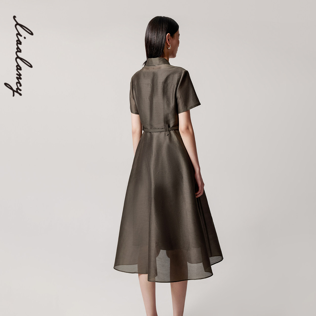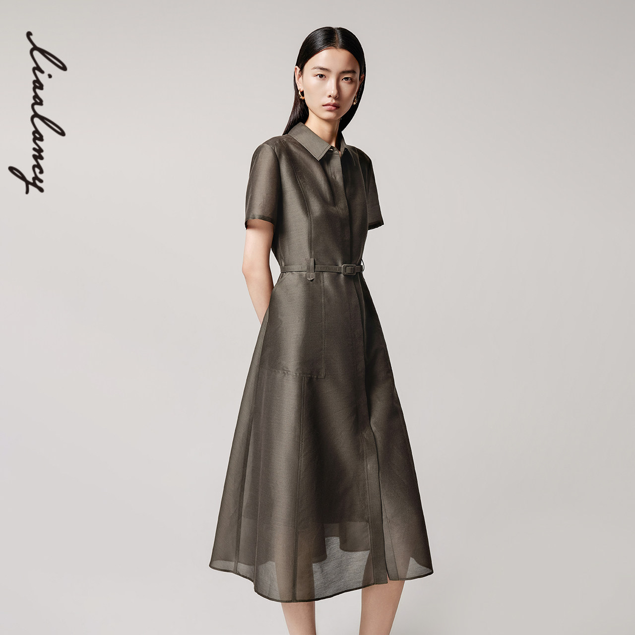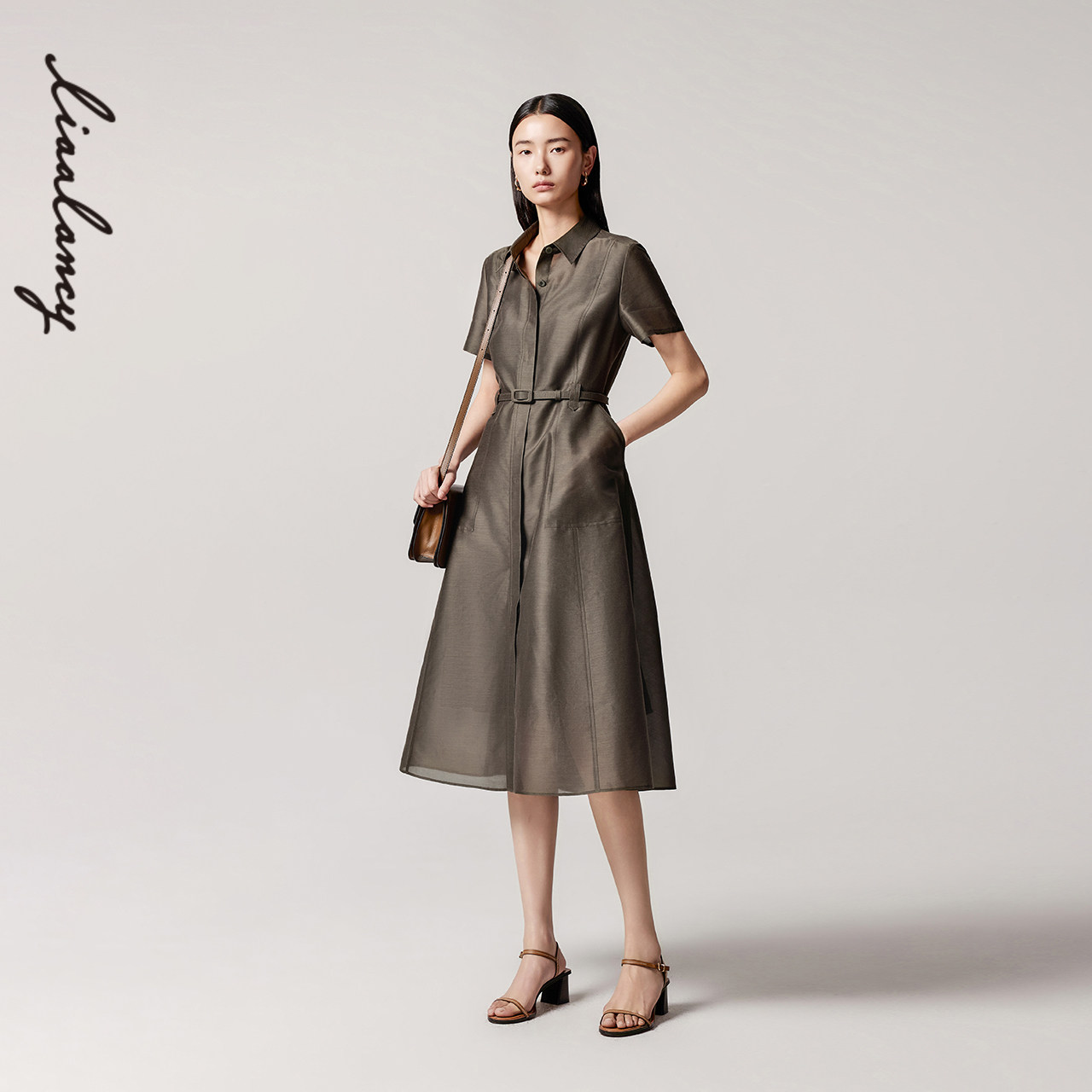 【桑蚕丝】LANCY/朗姿2025秋季新款高级感衬衫领收腰A字连衣裙子