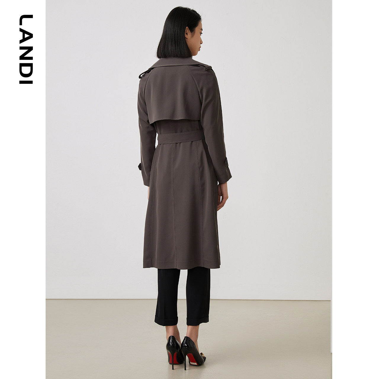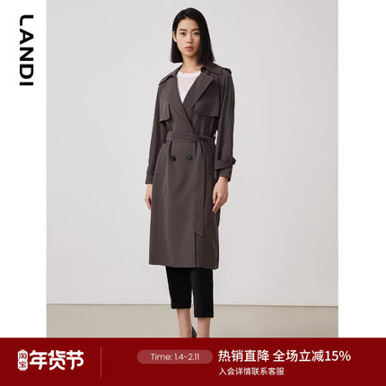 LANDI2023春季新款大翻领插肩袖双排扣中长款长袖风衣外套女