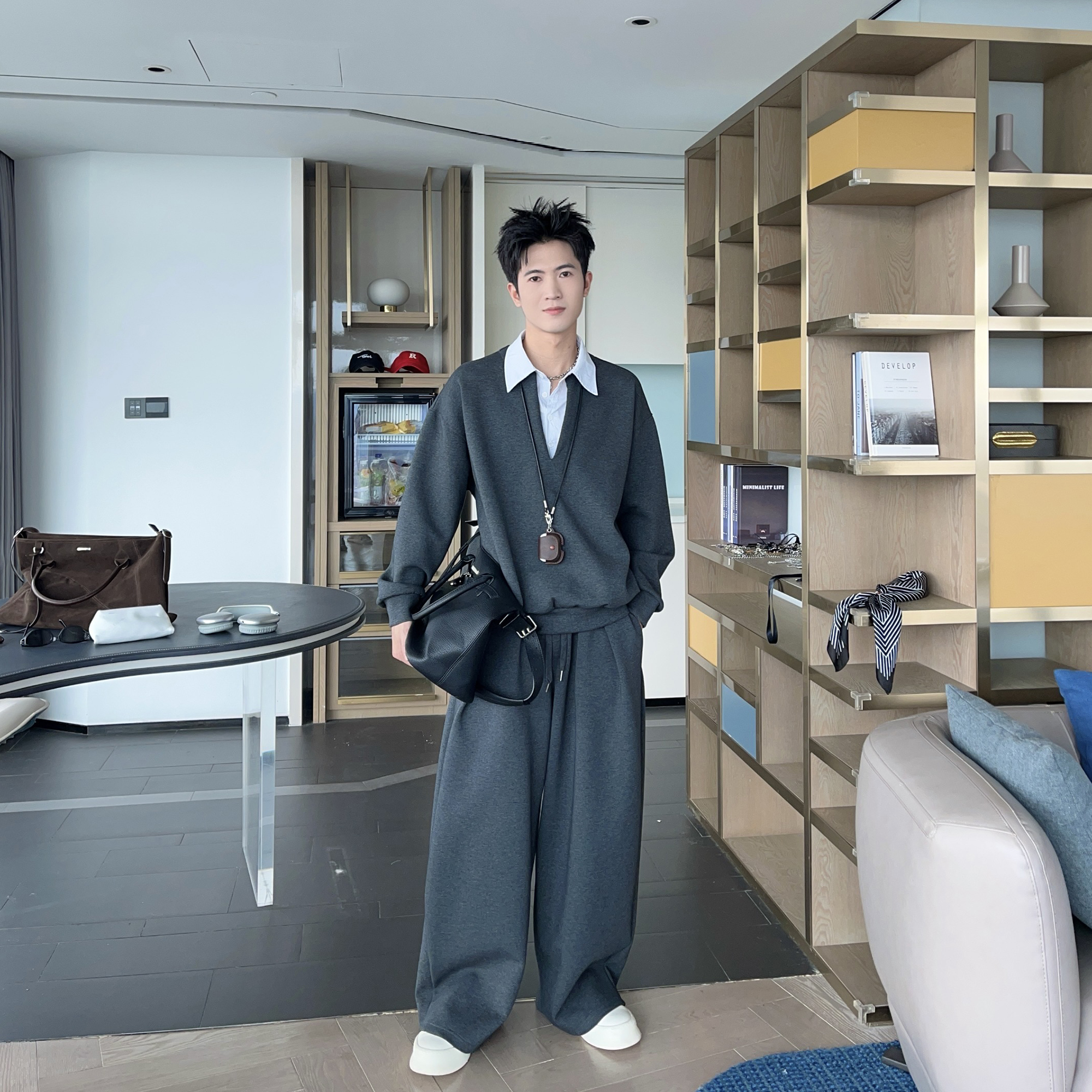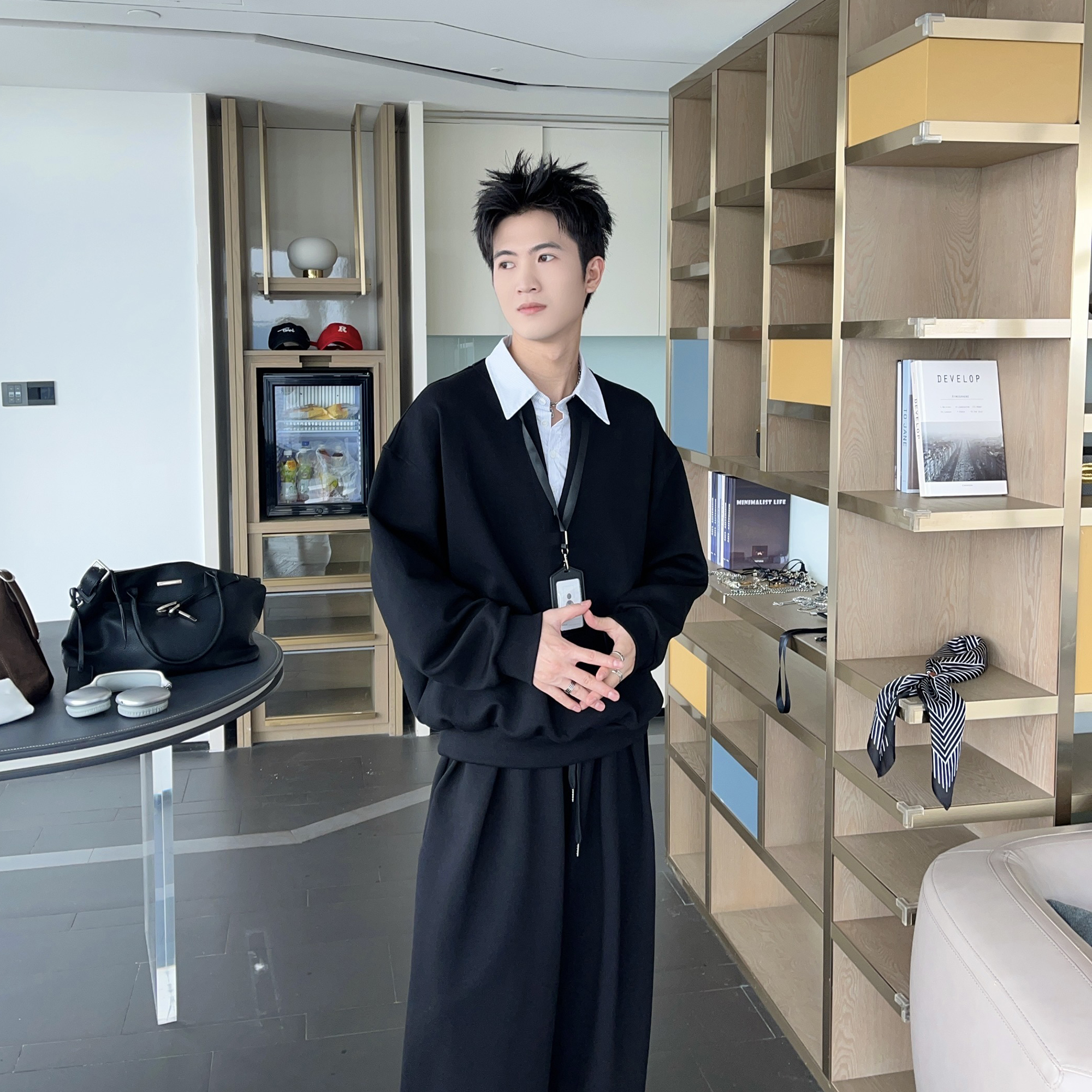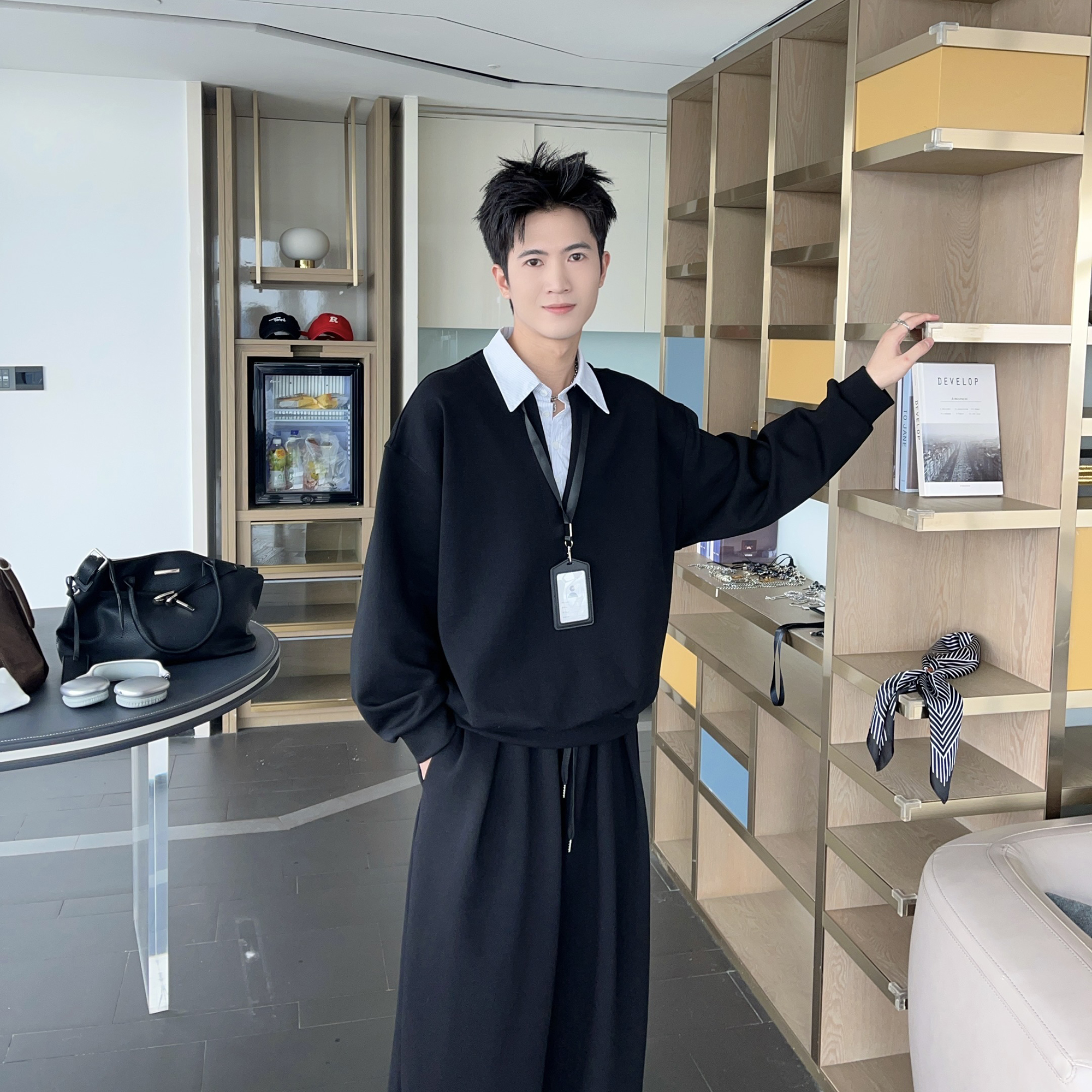 秋日ootd穿搭休闲衬衫领卫衣套装男生假两件衣服情侣款两件套搭配