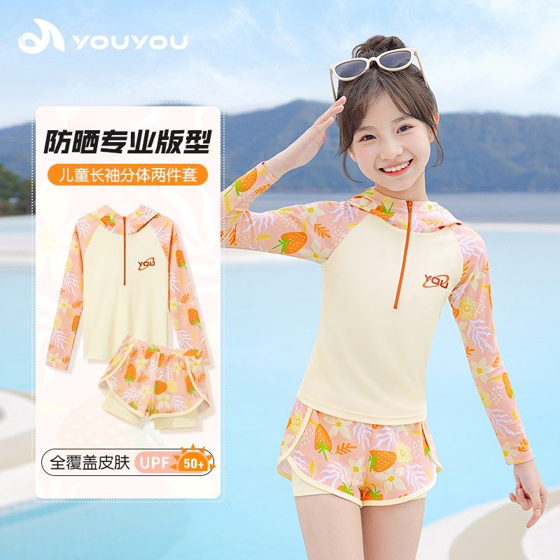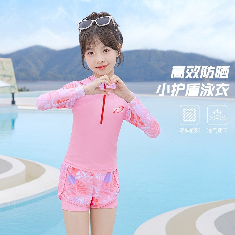 儿童泳衣女孩分体防晒长袖连帽游泳衣新款中大童女童专业训练装备