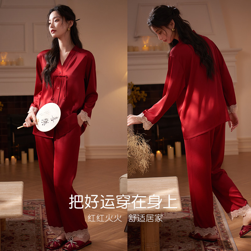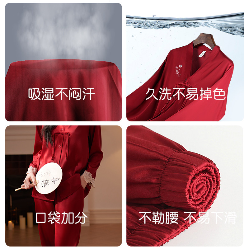 轩靓冰丝新中式国风睡衣女春秋季薄款仿真丝绸红色结婚家居服套装