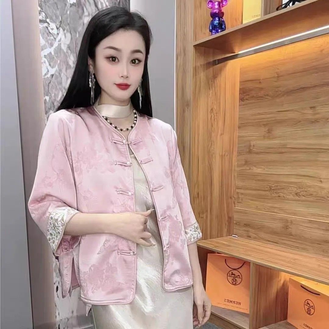 高级感粉色防晒衣新中式外套女夏薄七分袖醋酸锻开衫外搭上衣缎面