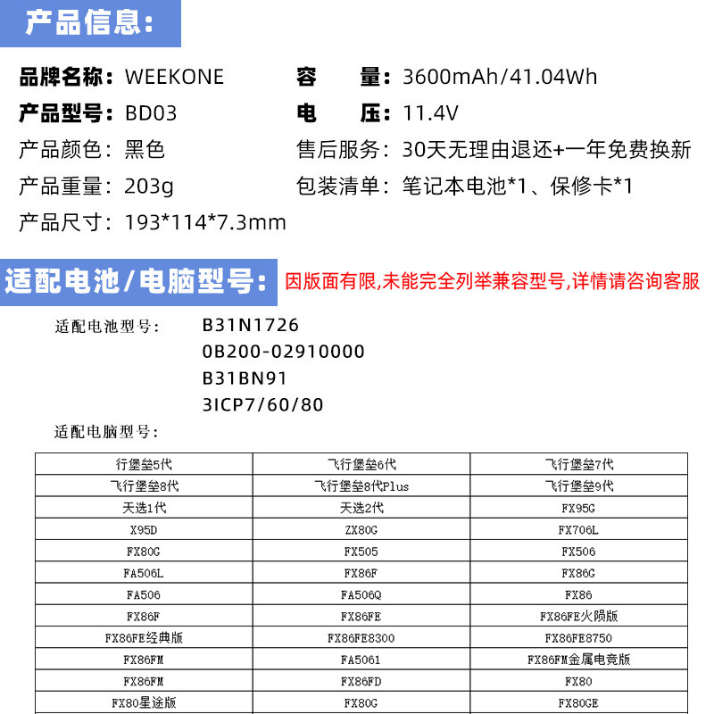 适用于华硕飞行堡垒5/6/7/8/9代FX80G FX86F/G FX95G B31N1726 FA506IU/II/IV FA507 天选1代2代笔记本电池