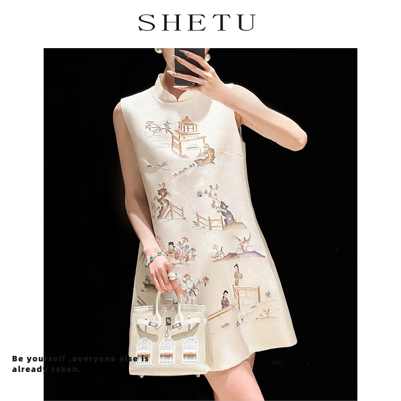 新中式复古禅意刺绣改良唐装背心裙夏季新款高级感立领国风连衣裙