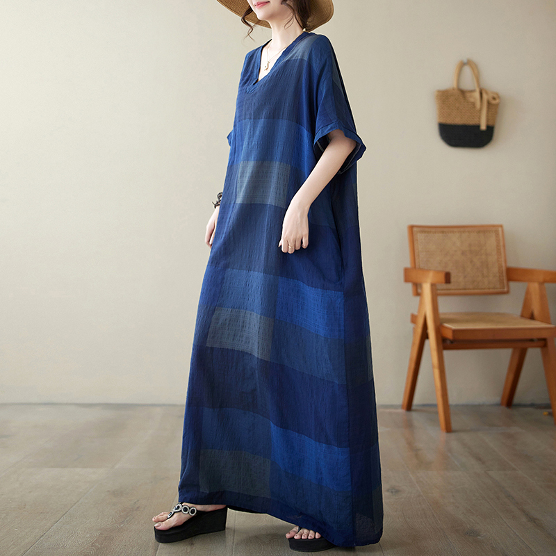 24夏季V领棉麻大码宽松文艺度假风沙滩裙复古遮肉长款袍子女薄款