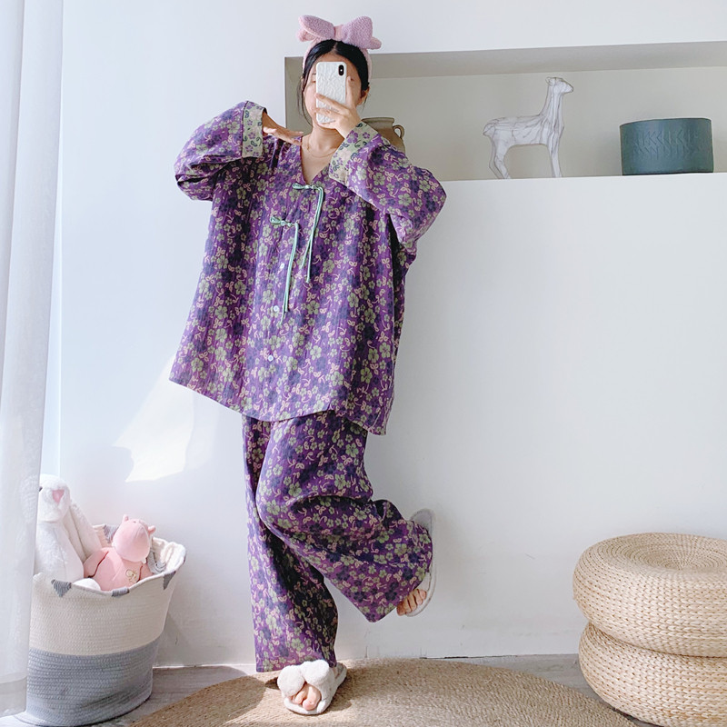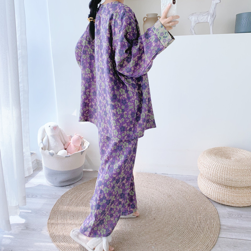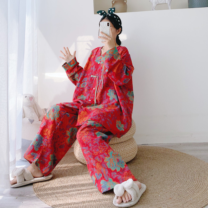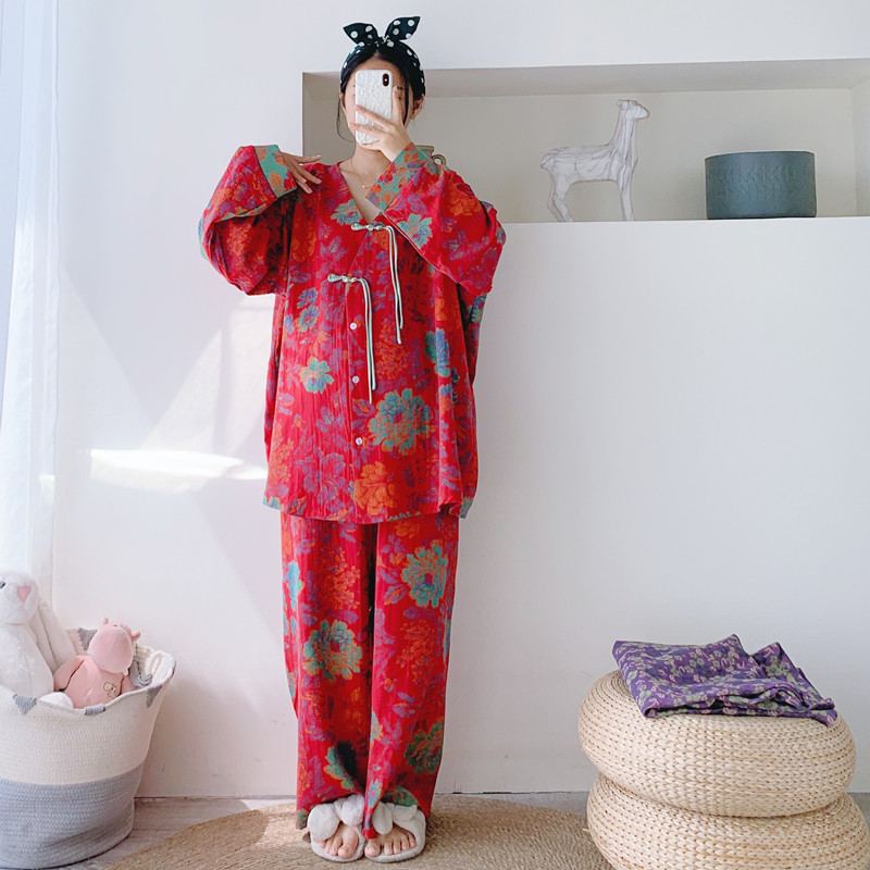 新中式开衫纯棉纱布睡衣长袖长裤加大码宽松胖mm200斤复古家居服