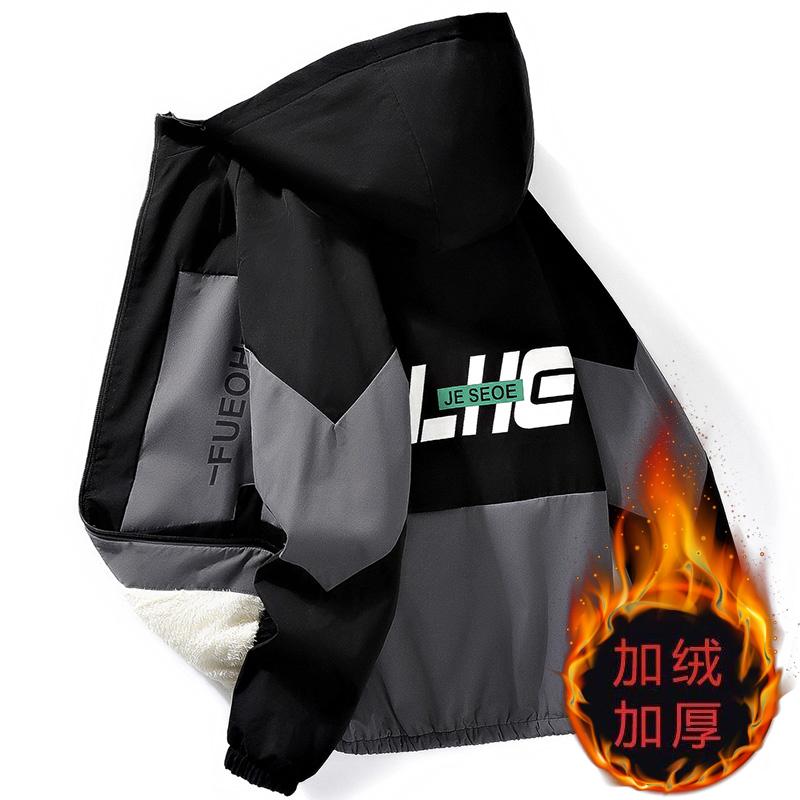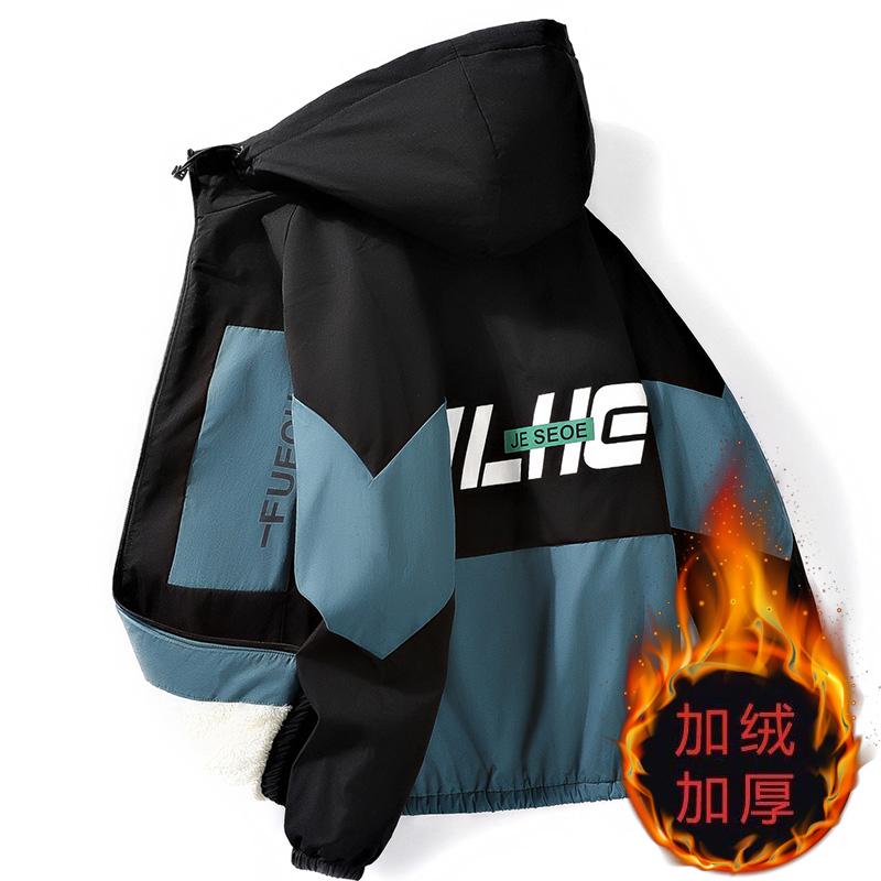 加绒加厚男士外套潮流韩版秋冬季男装夹克青少年学生连帽工装上衣