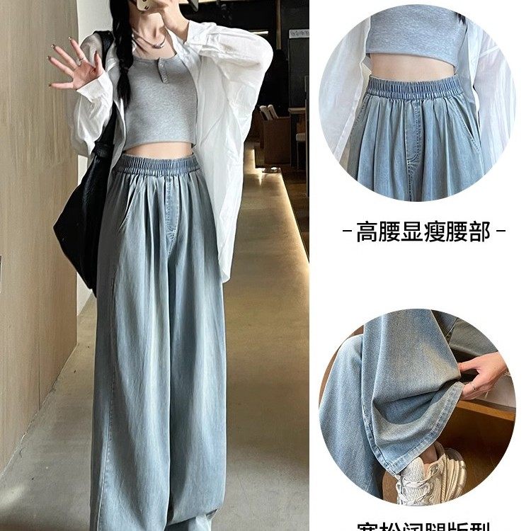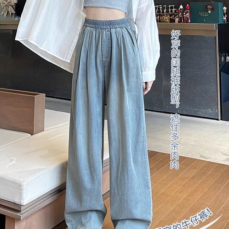 大码复古天丝牛仔裤女夏季薄款高腰宽松显瘦直筒窄版阔腿裤松紧腰