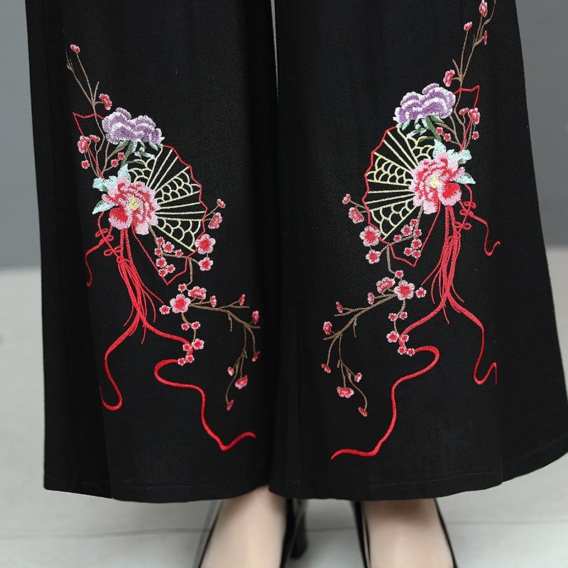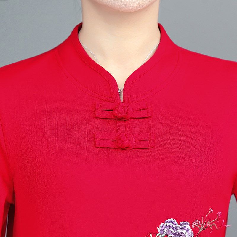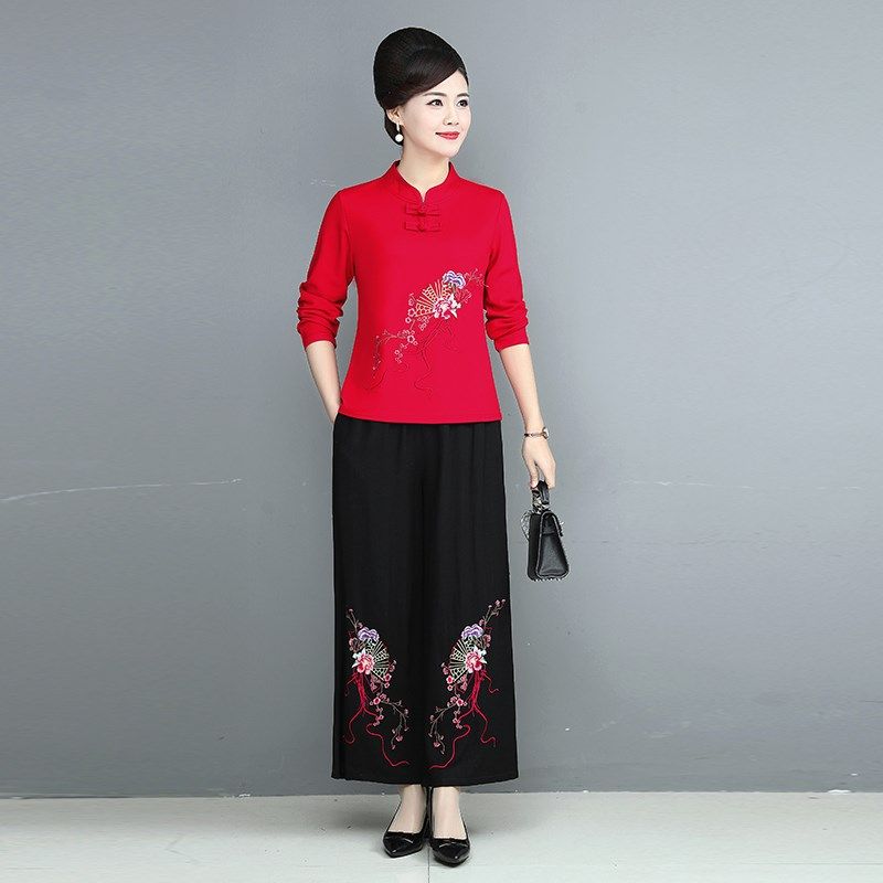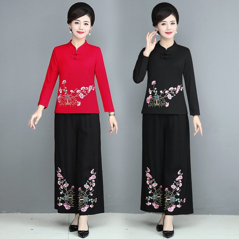 中年女装春秋新款民族风套装复古文艺妈妈唐装绣花上衣裤子两件套