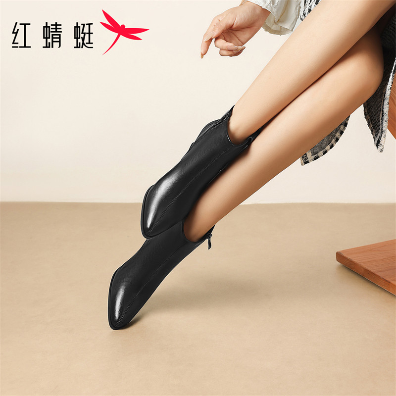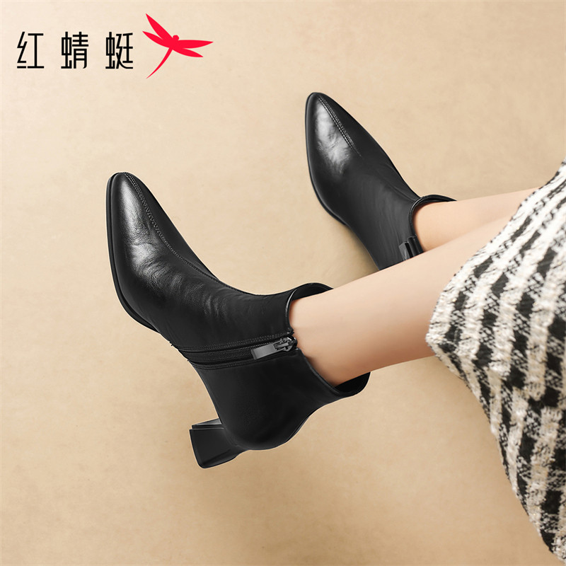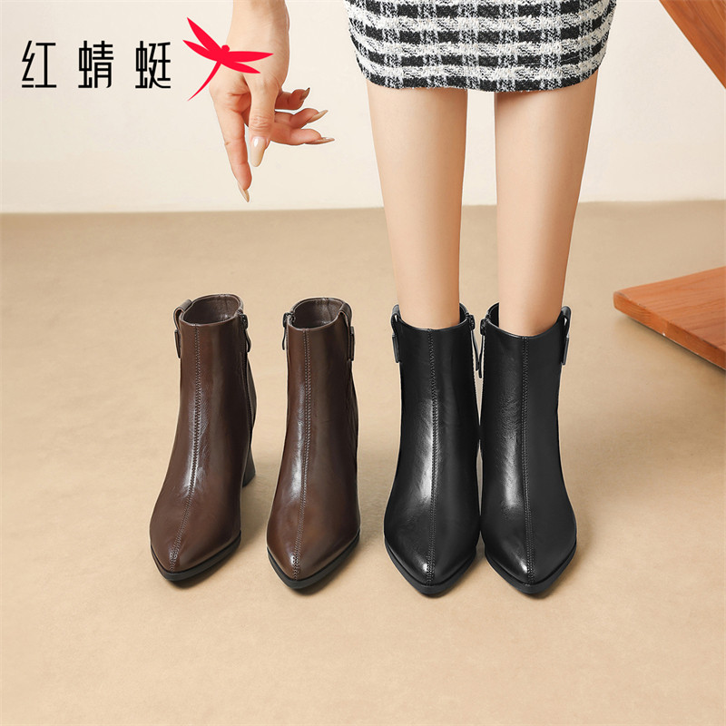 红蜻蜓尖头时尚短靴2025新款棕色粗跟气质女靴真皮法式高跟时装靴