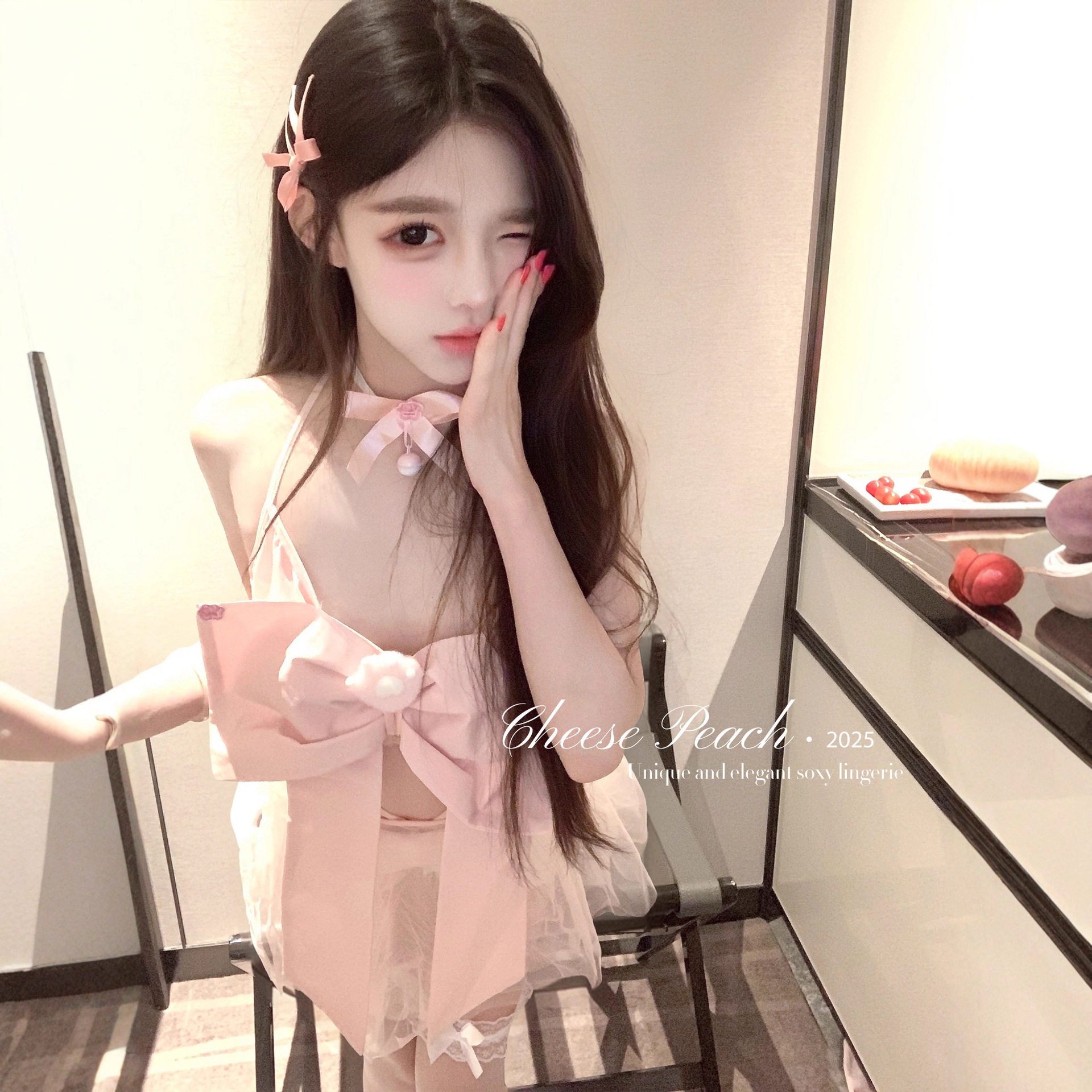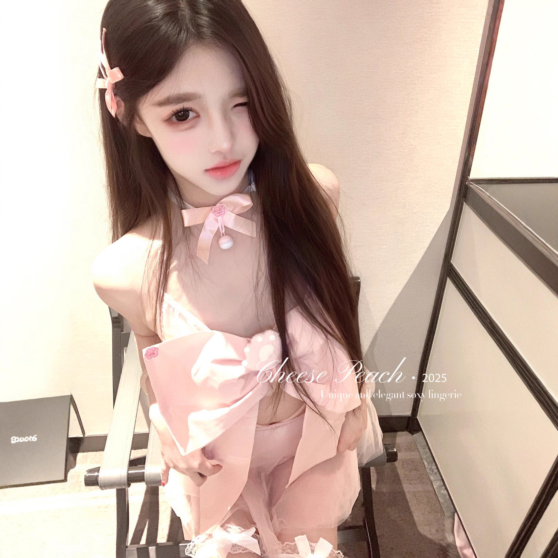 蜜桃喵诱*纯欲可爱蝴蝶结网纱透视粉色小胸加大码猫咪cos制服套装