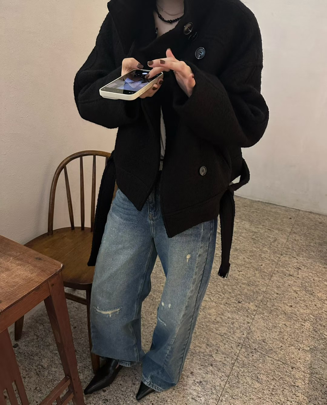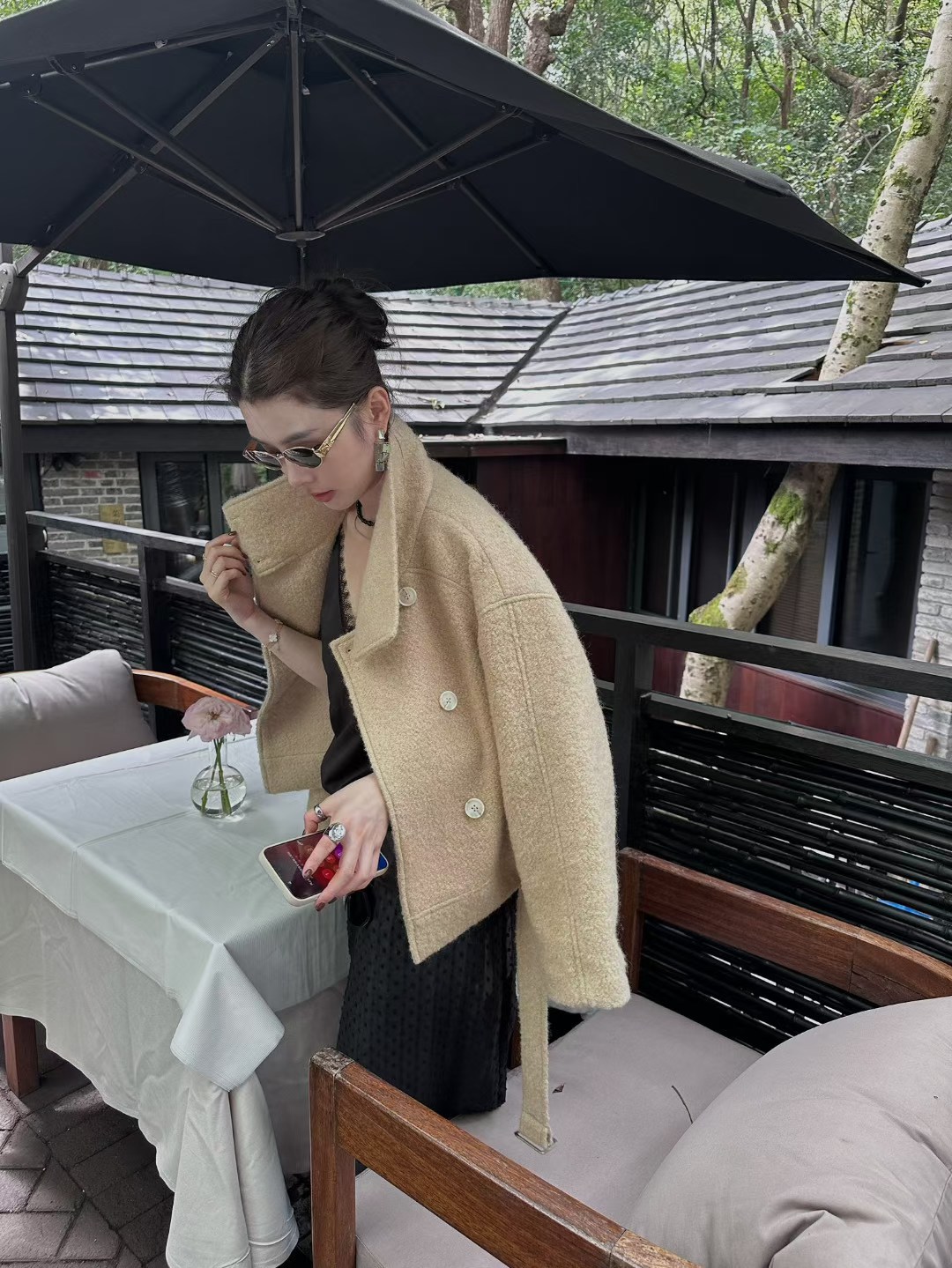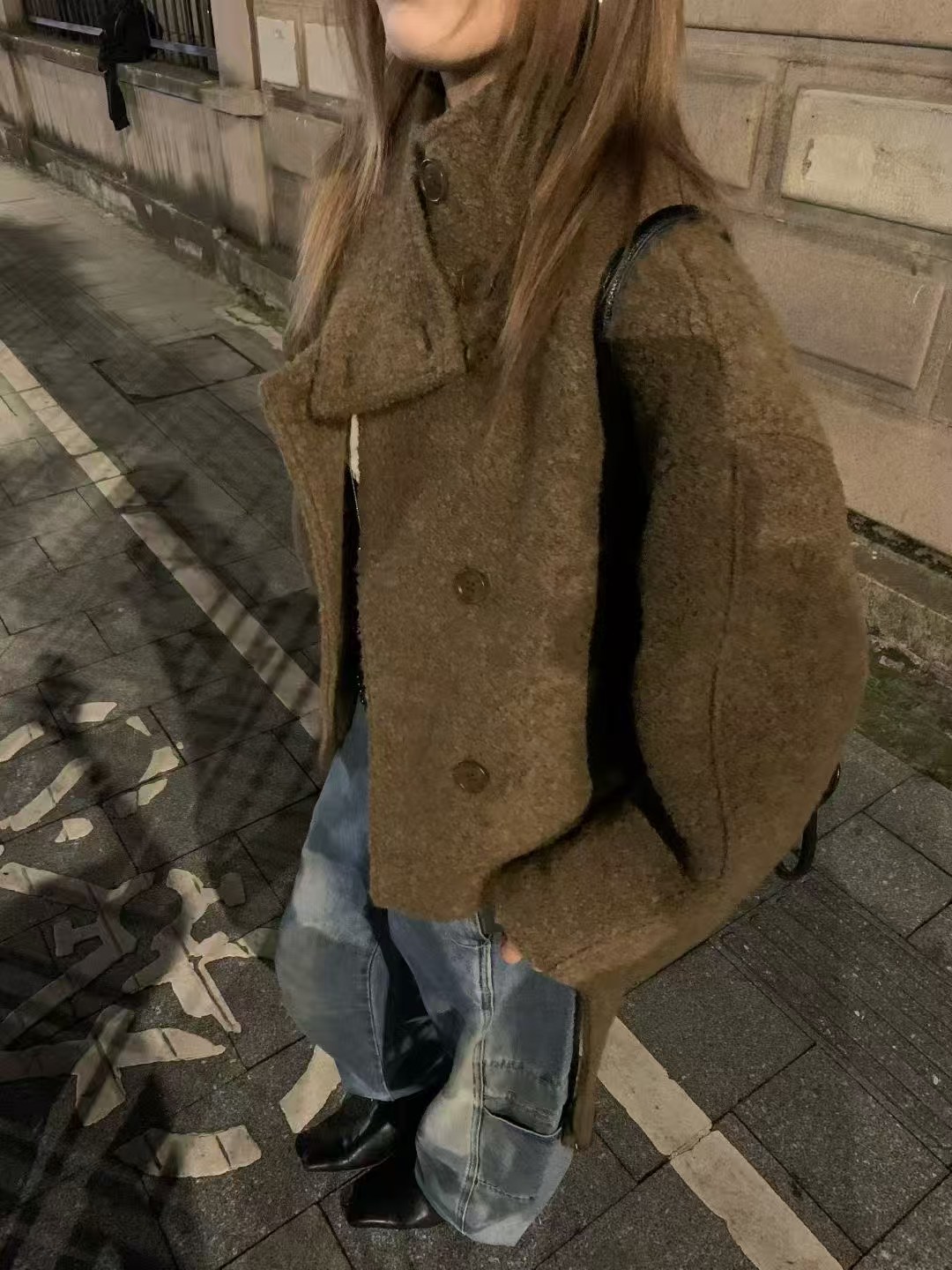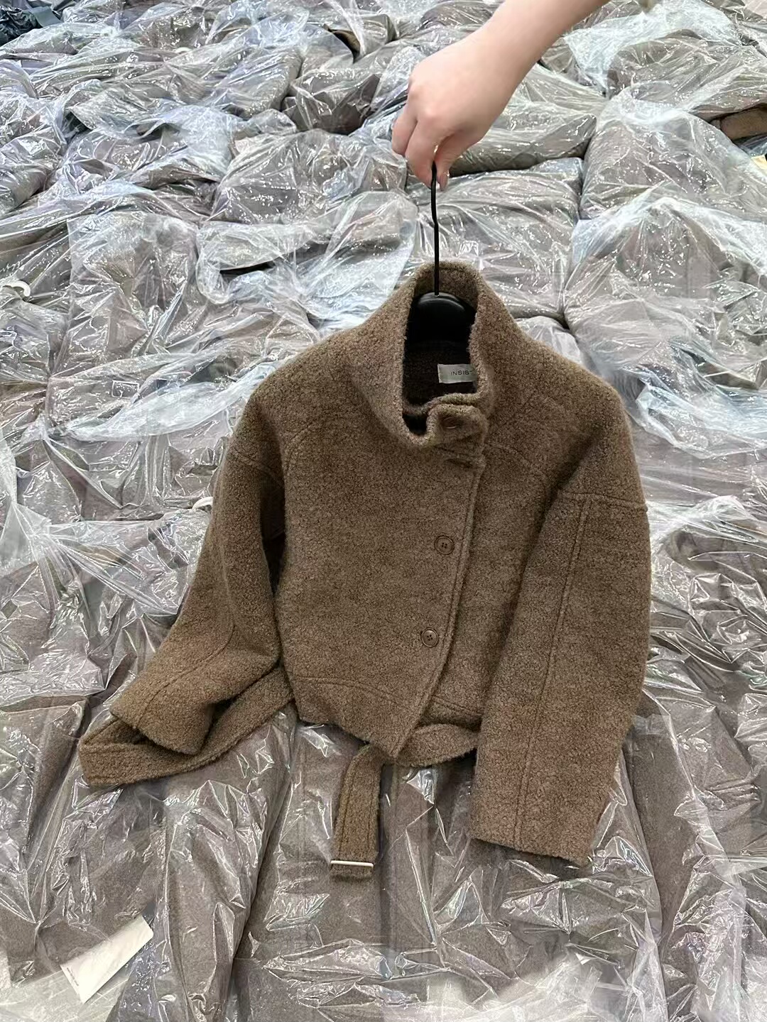 秋冬韩版insist复古深咖色配腰带含羊毛短款毛呢外套女小个子大衣