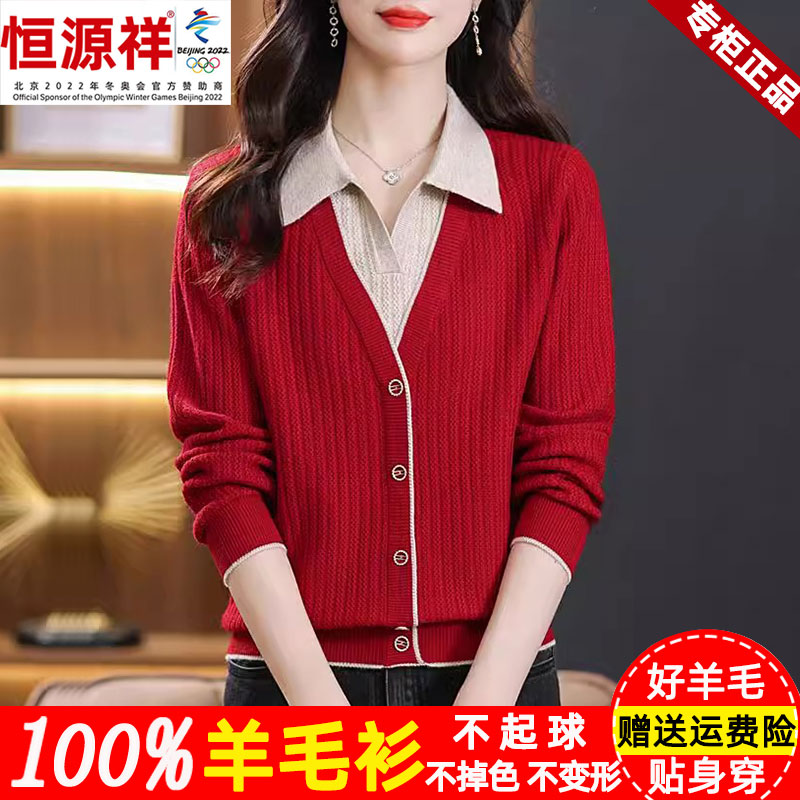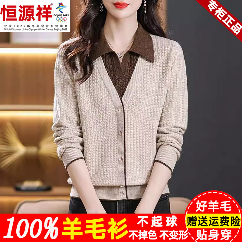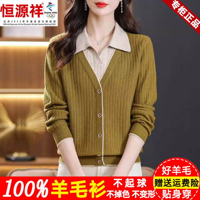 恒源祥集团彩羊羊毛衫女100纯羊毛春秋宽松假两件女士毛衣打底衫